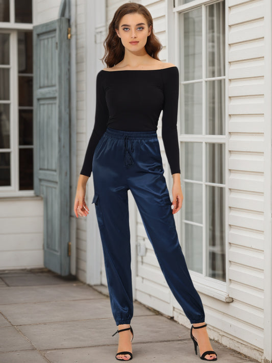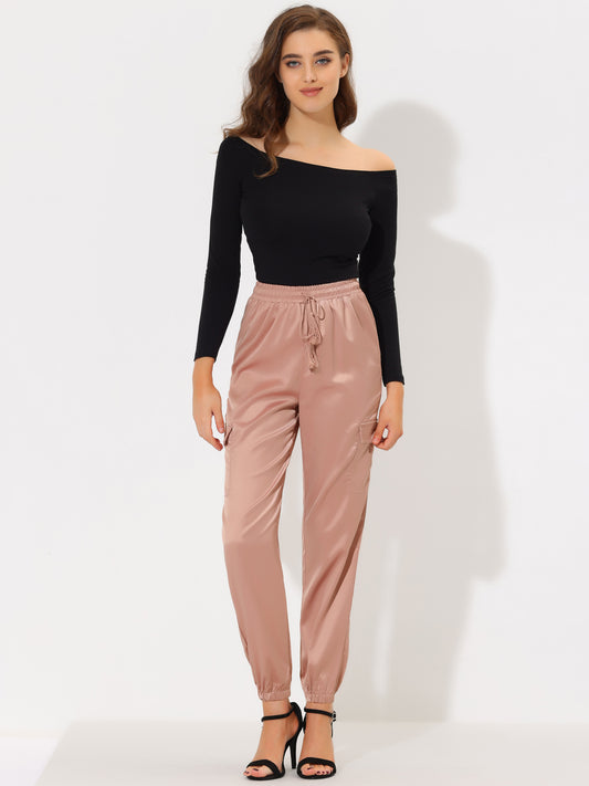 Pantalones deportivos de satén para mujer con cordón elástico, cintura alta, brillantes y sedosos, cargo.
