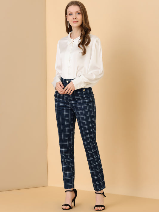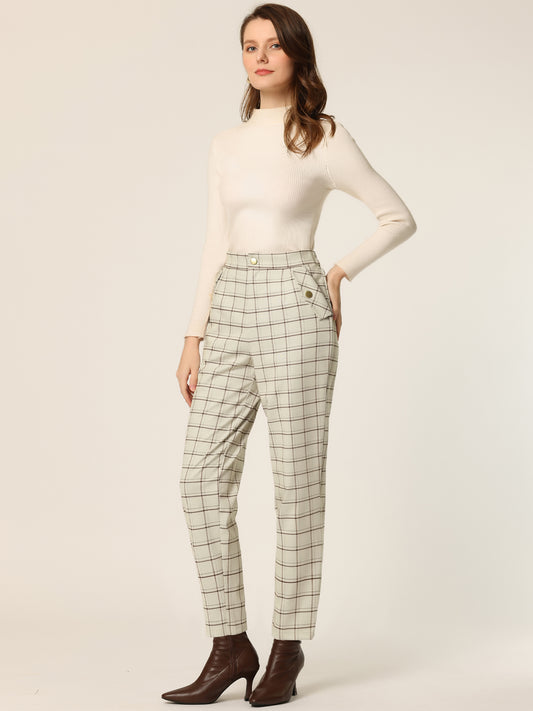 Pantalones de trabajo informales con botones y cuadros escoceses para mujer