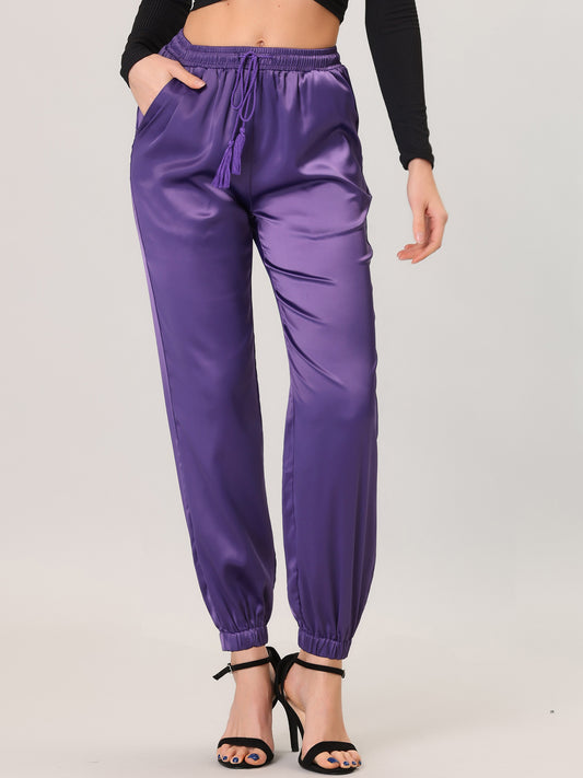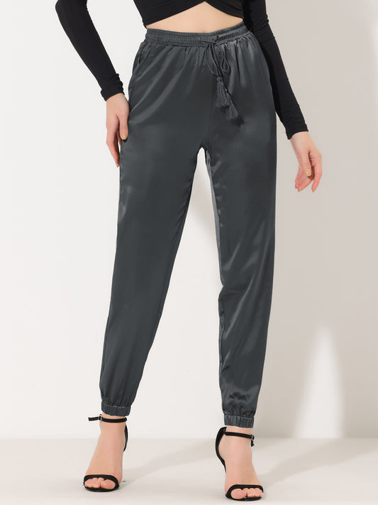 Pantalones deportivos casuales de satén con cintura elástica y cordón para mujer, largos hasta el tobillo, con bolsillo