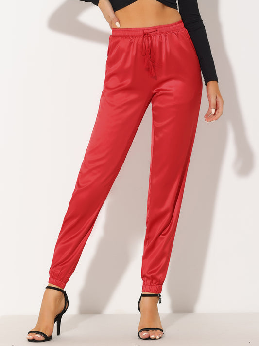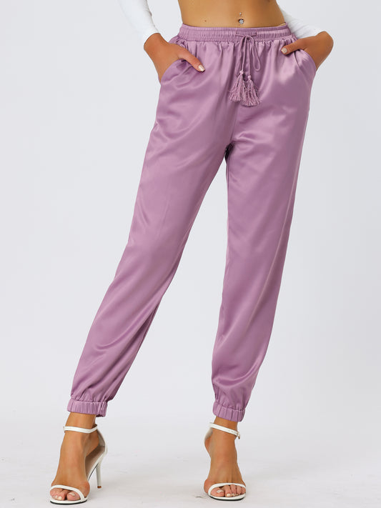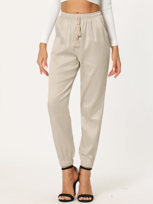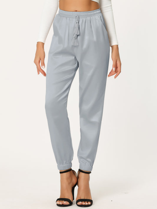Pantalones deportivos casuales de satén con cintura elástica y cordón para mujer, largos hasta el tobillo, con bolsillo