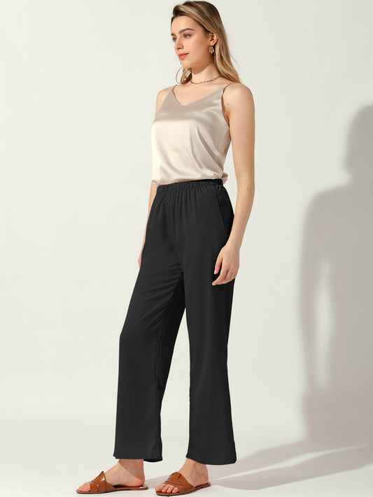 Pantalones casuales de cintura alta elástica para mujer, pantalones anchos de satén