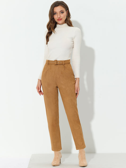 Pantalones de gamuza sintética para mujer, informales, de cintura alta, con cinturón y piernas rectas
