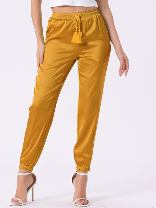 Pantalones deportivos casuales de satén con cintura elástica y cordón para mujer, largos hasta el tobillo, con bolsillo