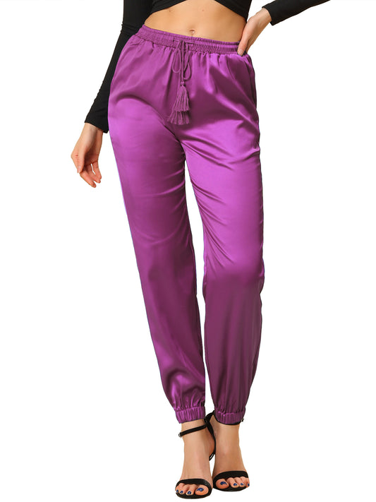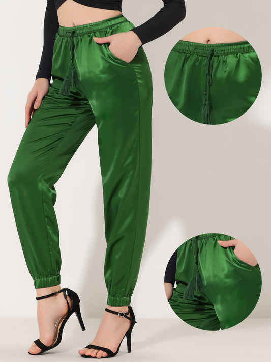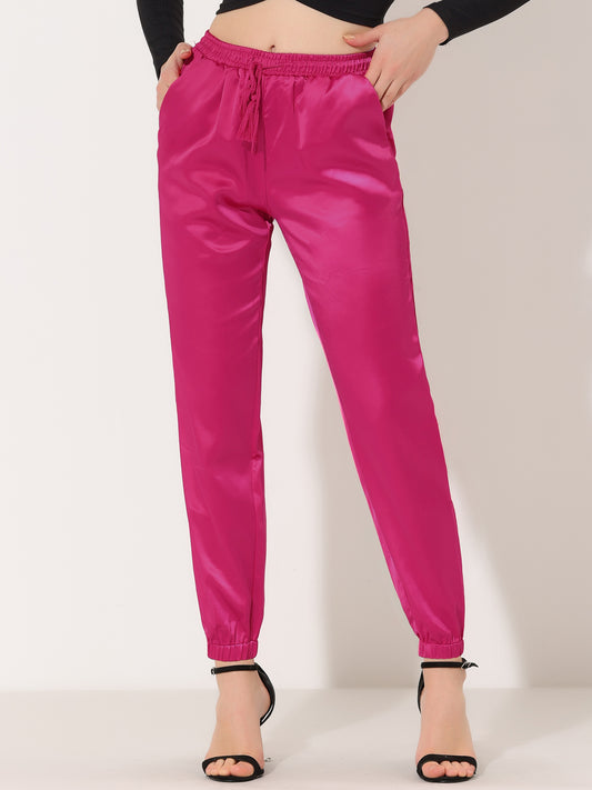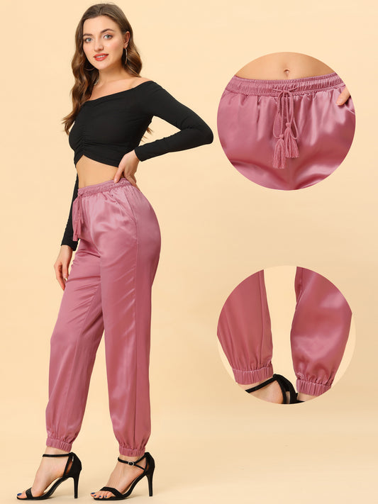 Pantalones deportivos casuales de satén con cintura elástica y cordón para mujer, largos hasta el tobillo, con bolsillo