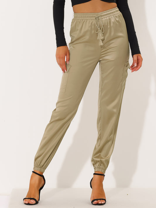 Pantalones deportivos de satén para mujer con cordón elástico, cintura alta, brillantes y sedosos, cargo.