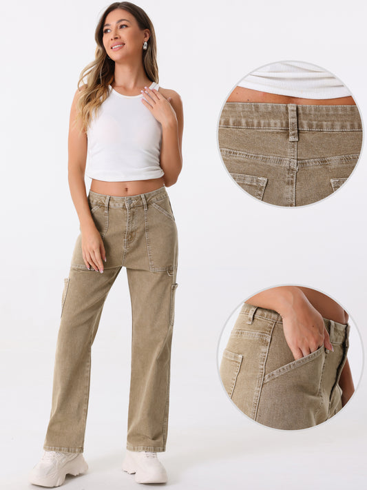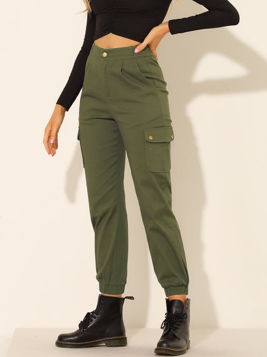 Pantalones cargo informales de sarga elástica de cintura alta para mujer con bolsillos