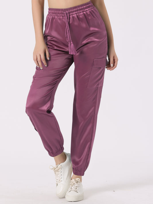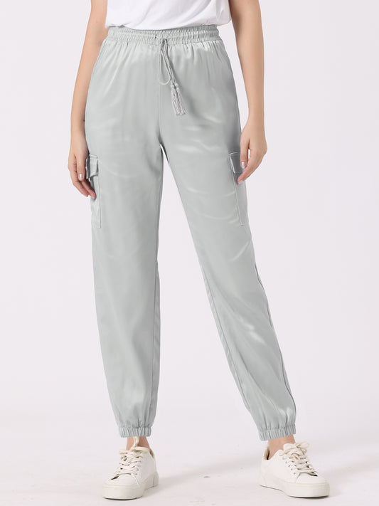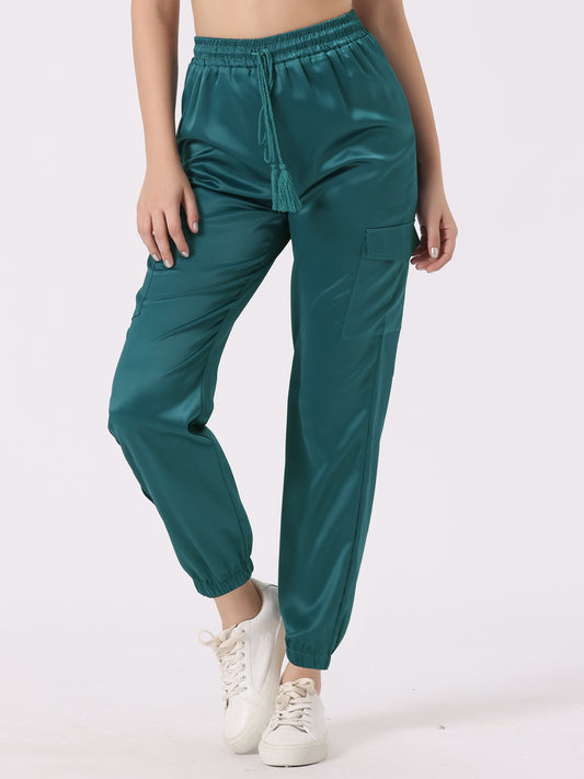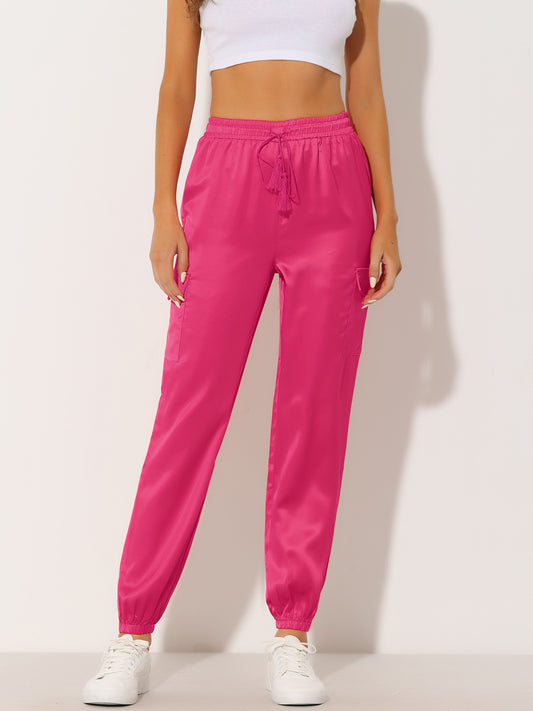 Pantalones deportivos de satén para mujer con cordón elástico, cintura alta, brillantes y sedosos, cargo.