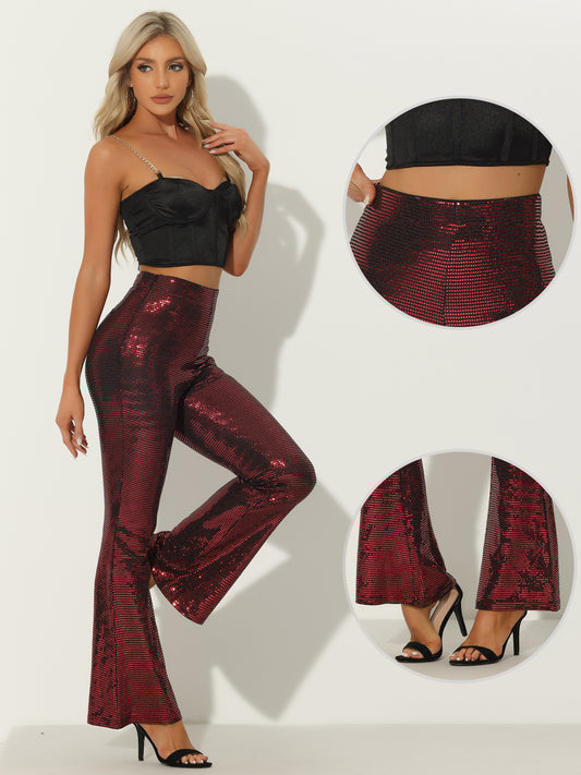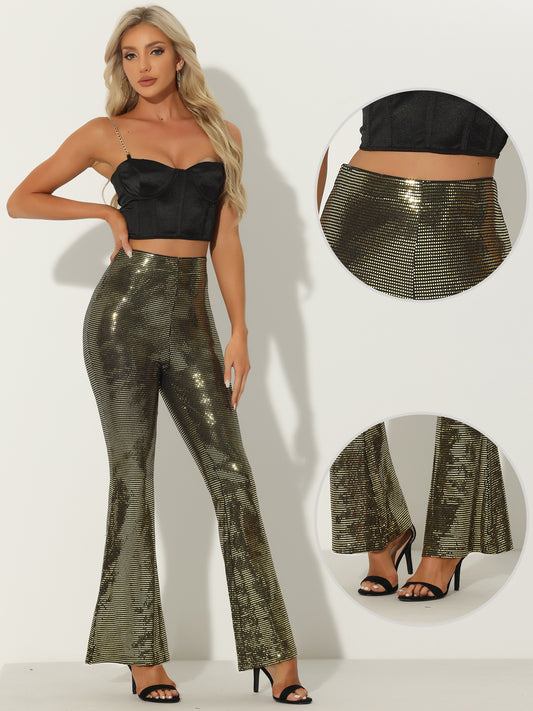 Pantalones acampanados con lentejuelas para mujer, cintura alta, elásticos, estilo retro vintage de los años 80, largos y brillantes.