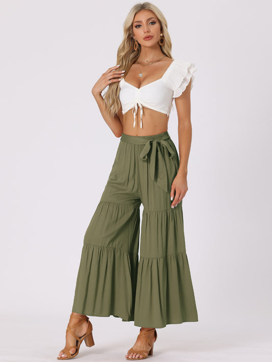 Pantalones Palazzo anchos acampanados con volantes y cintura alta elástica estilo bohemio para mujer