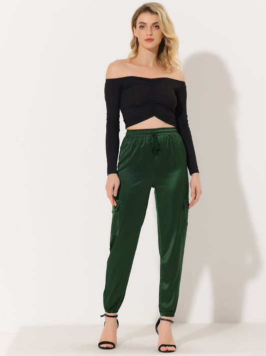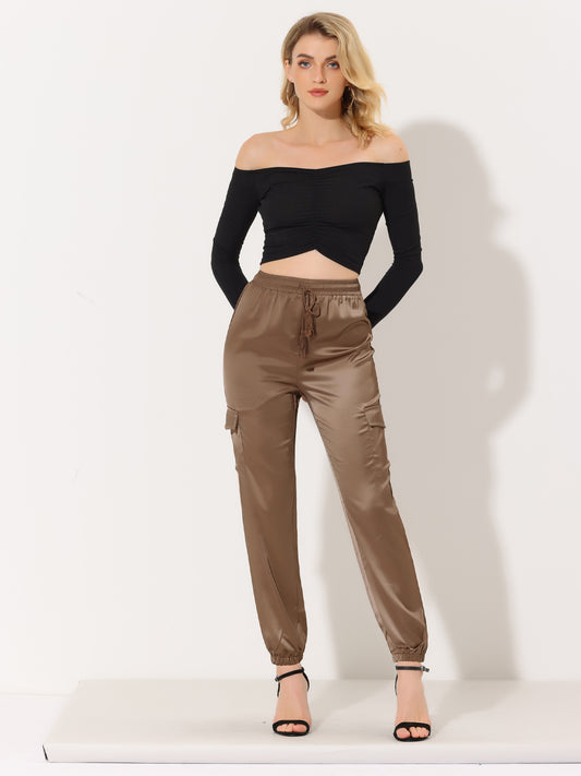 Pantalones deportivos de satén para mujer con cordón elástico, cintura alta, brillantes y sedosos, cargo.