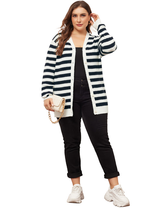 Women Plus Size Cardigan Sweater V Neck Button Down Open Front Long Sleeve Striped Knit Cardigans