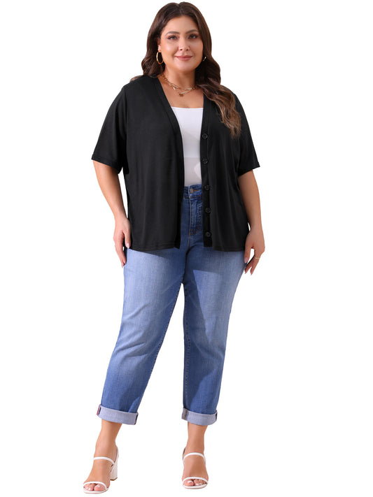 Women Plus Size Cardigan Button Down Sheer Round Neck Short Sleeve Knitted Sweater