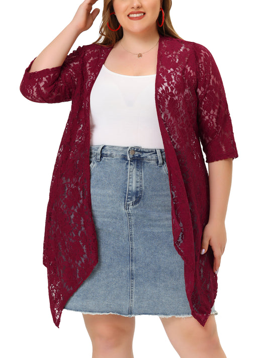 Women Plus Size Cardigans Open Front 3/4 Bell Sleeve Sheer Lightweight Lace Cover Up