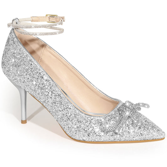 Zapatos de tacón de aguja con punta puntiaguda y lazo de diamantes de imitación para mujer