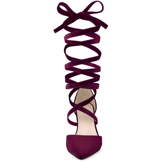 Zapatos de tacón grueso con cordones y punta puntiaguda de terciopelo para mujer