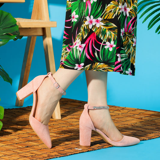 Zapatos de tacón grueso con tiras en el tobillo y punta puntiaguda de diamantes de imitación para mujer