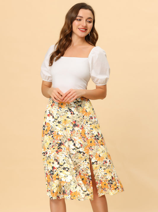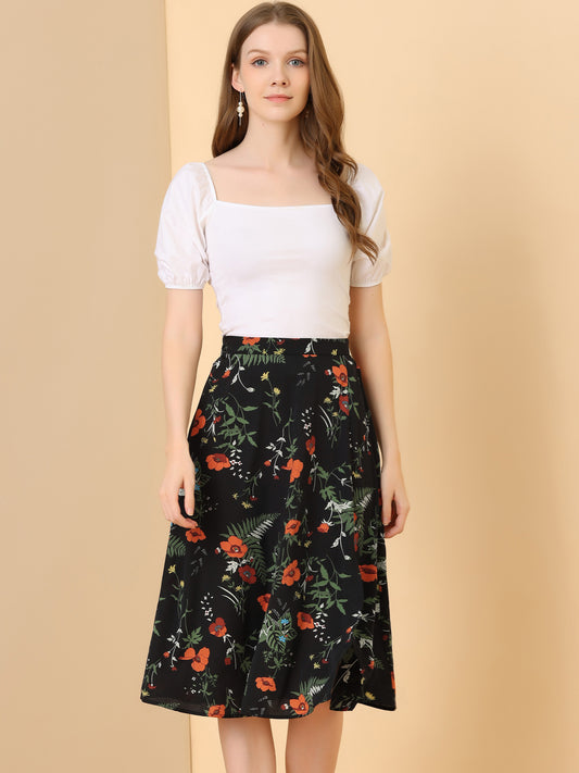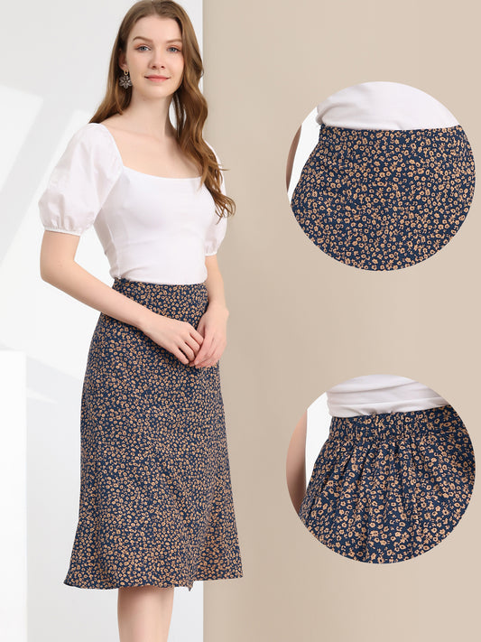 Falda midi floral para mujer, cintura elástica, corte A, estampado de florecitas