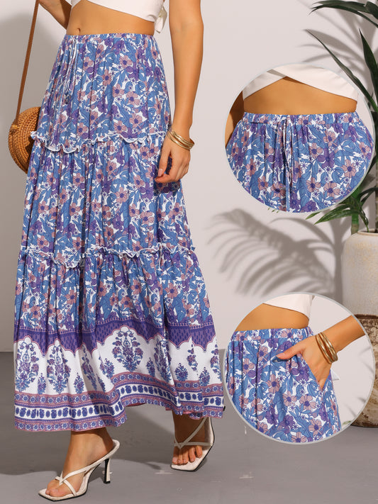 Faldas largas de verano estilo bohemio con estampado floral y volantes de cintura alta elástica para mujer