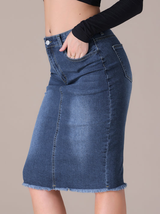 Falda vaquera para mujer, cintura alta, dobladillo sin rematar, bolsillos, elástica, hasta la rodilla