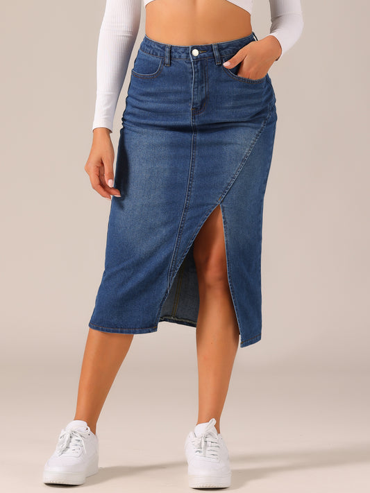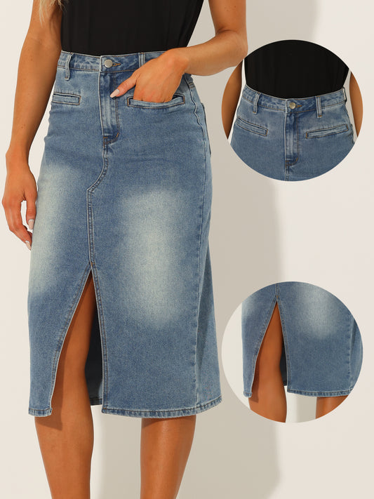 Falda vaquera de mujer con cintura alta, abertura frontal, lavado, midi, con bolsillos