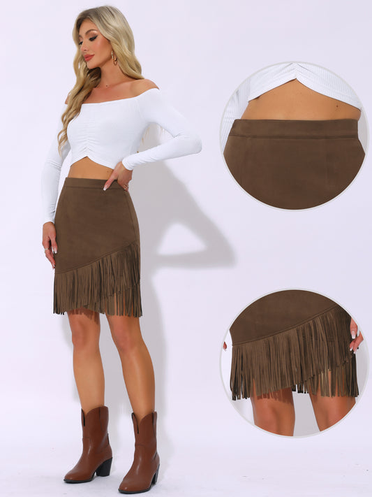 Minifalda ajustada elástica de gamuza sintética vintage con cintura alta y flecos para mujer