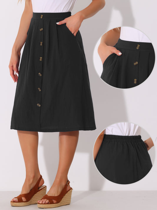Falda midi plisada informal de cintura alta elástica con botones y bolsillos para mujer