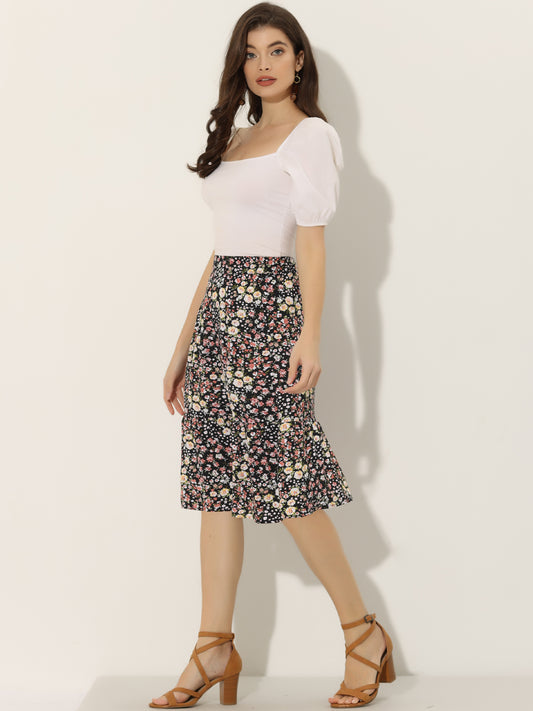 Faldas midi florales para mujer, de verano, con volantes, cintura alta, fluidas, corte A, con abertura hasta la rodilla
