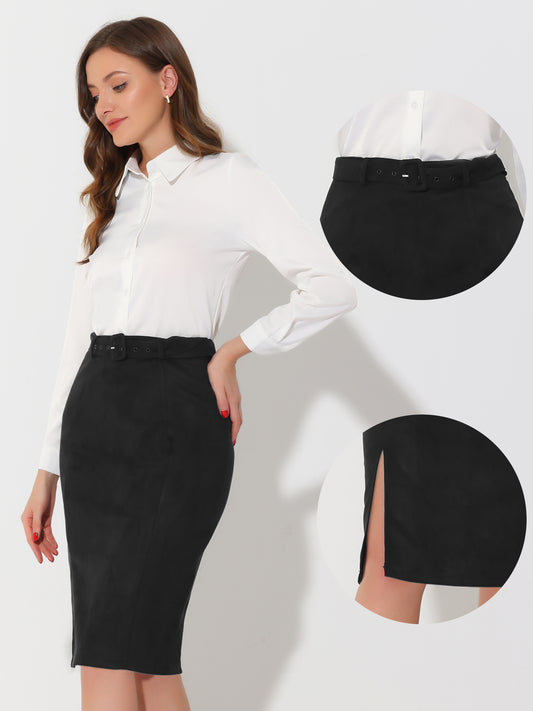Faldas de gamuza sintética para mujer, cintura alta, con cinturón, hasta la rodilla, falda tubo con abertura