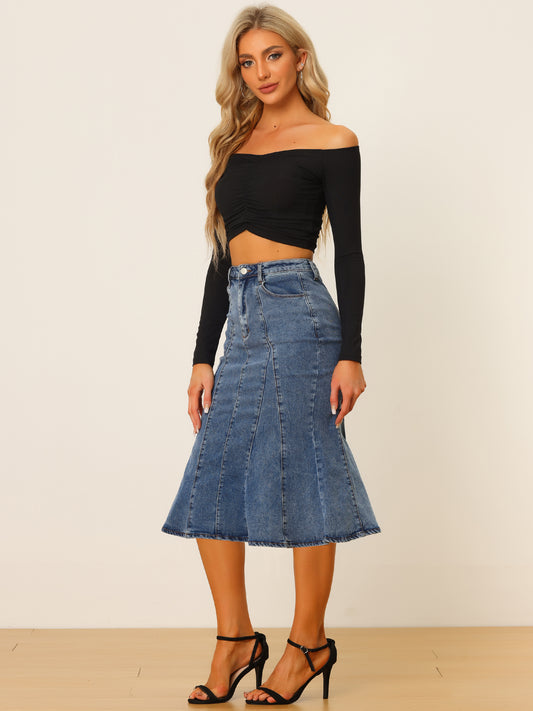 Falda vaquera midi ajustada de cintura alta con volantes y cola de pez para mujer