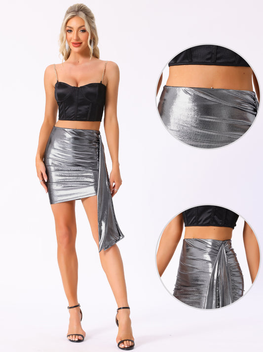 Minifalda ajustada de fiesta con cintura alta metalizada y fruncido asimétrico para mujer