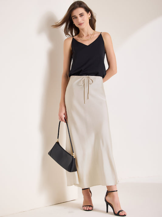 Falda larga de verano acampanada con cordón y cintura alta de satén para mujer