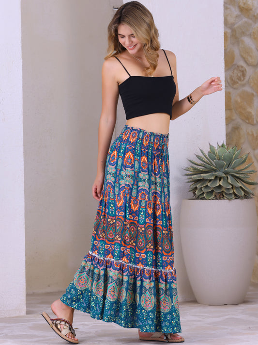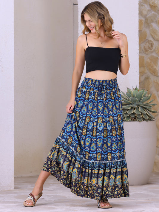 Falda larga estilo A con cintura alta y fruncido floral estilo bohemio para mujer