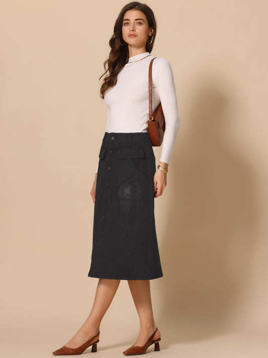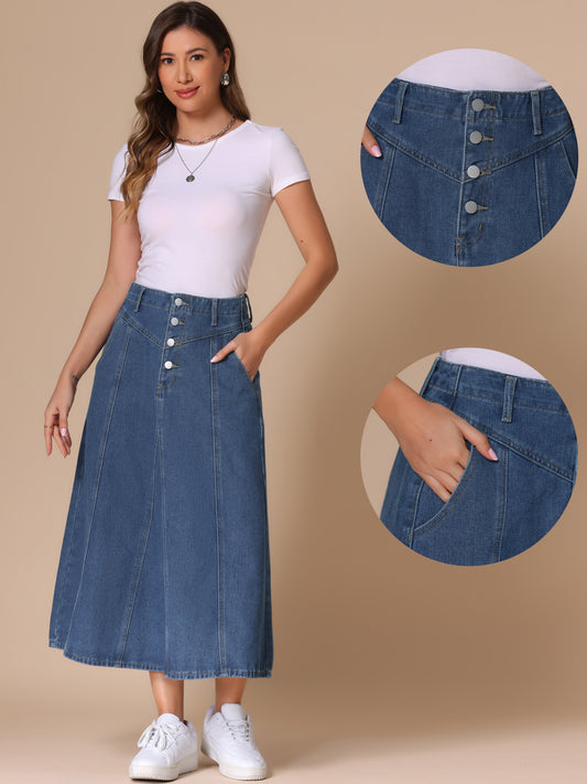Falda vaquera midi de cintura alta con botones delanteros y corte A para mujer