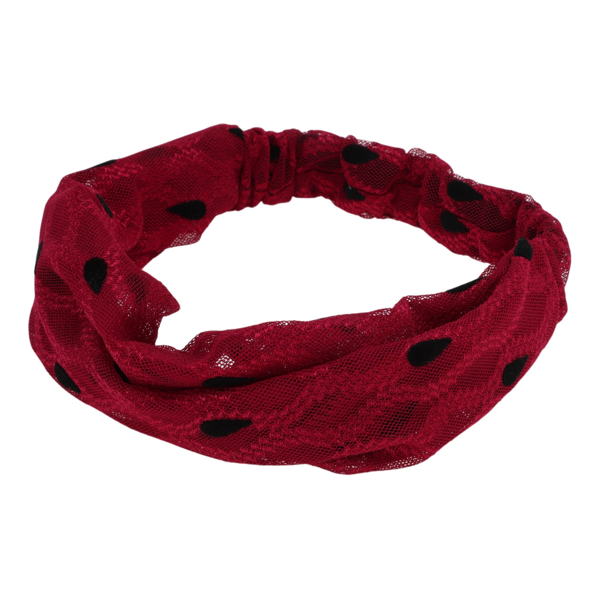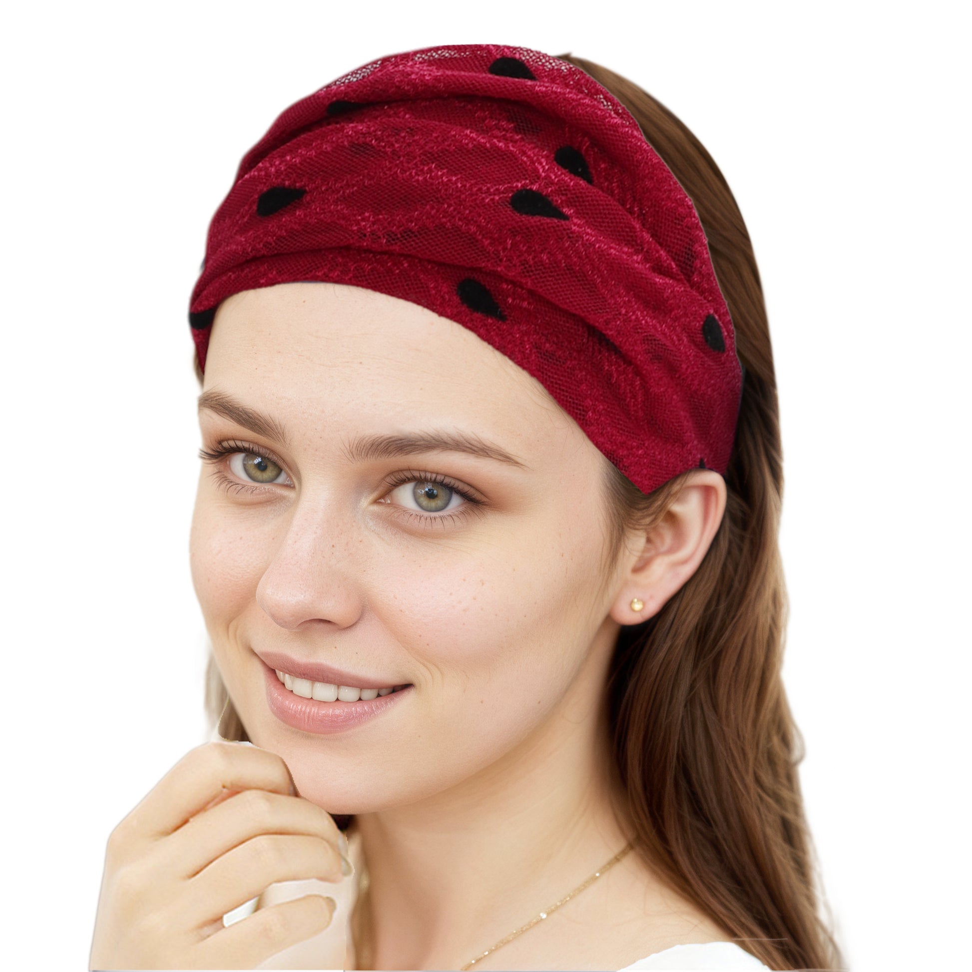 Diadema ancha de encaje de malla con lunares para mujer, color rojo vino, 1 unidad