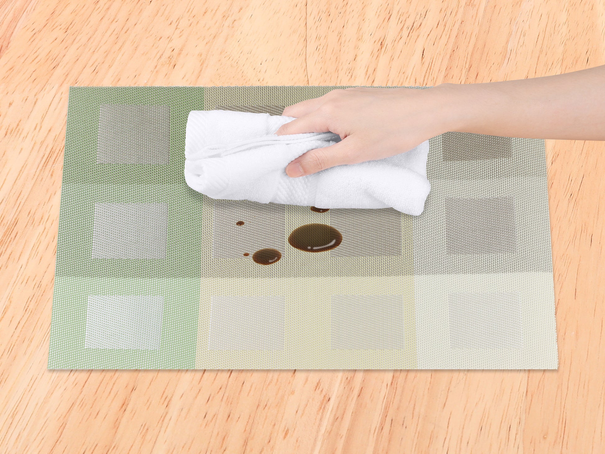 - Estos manteles individuales lavables se pueden usar simplemente limpiándolos con un paño húmedo o una toalla cuando haya residuos, lo que mejorará su experiencia gastronómica.