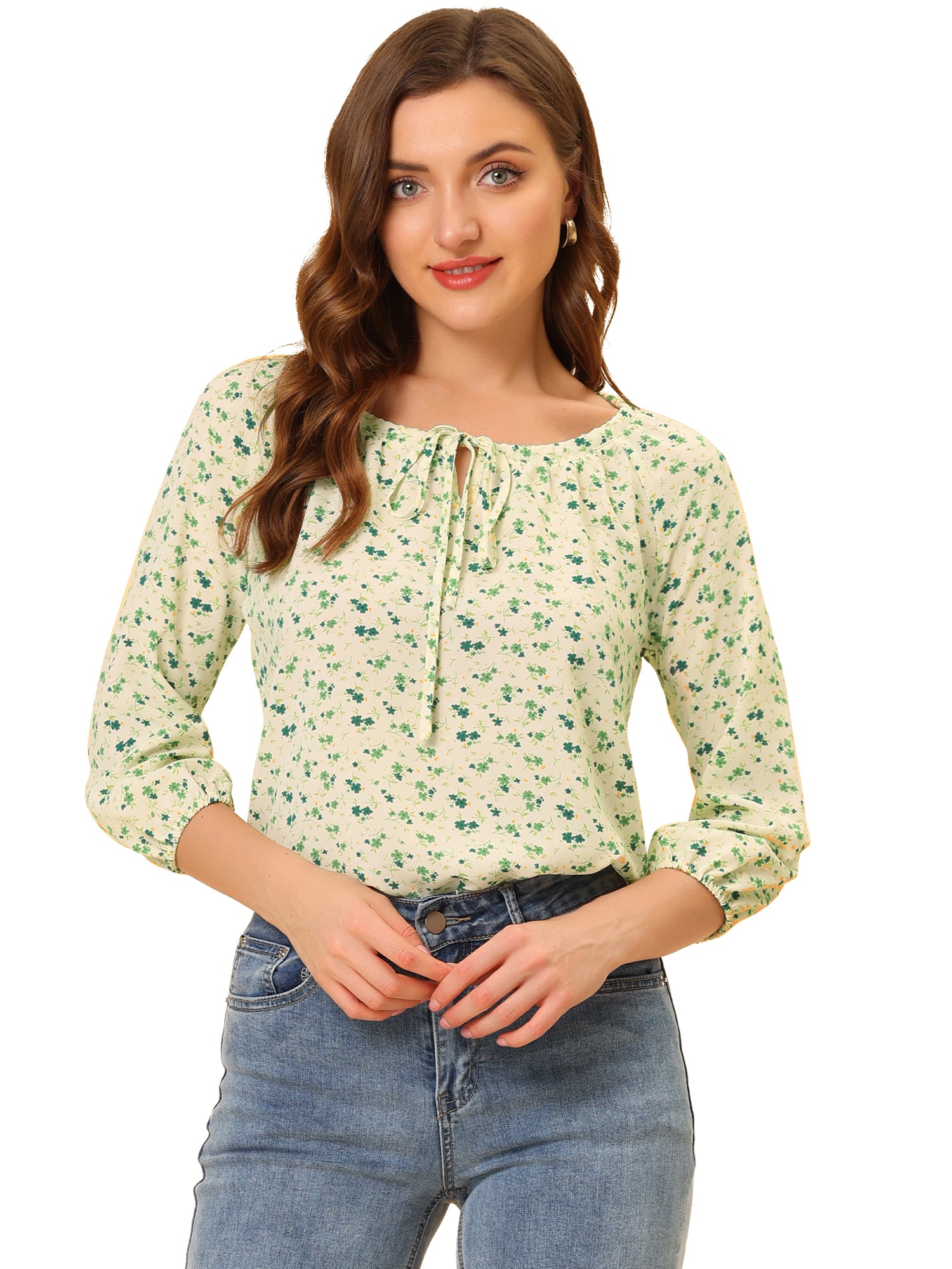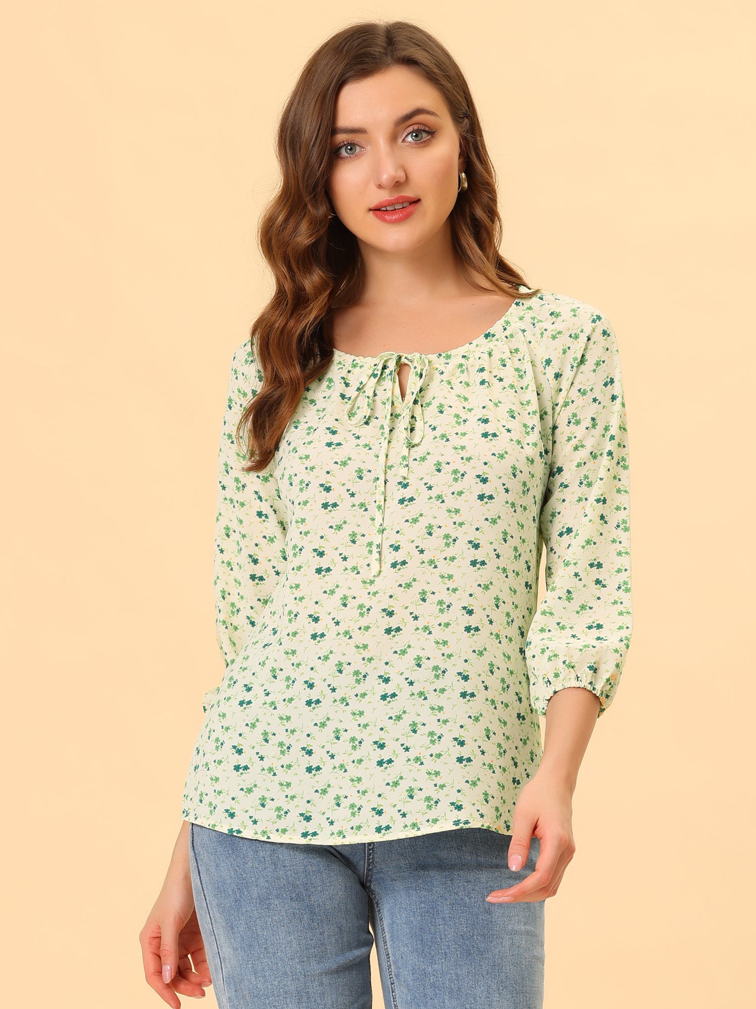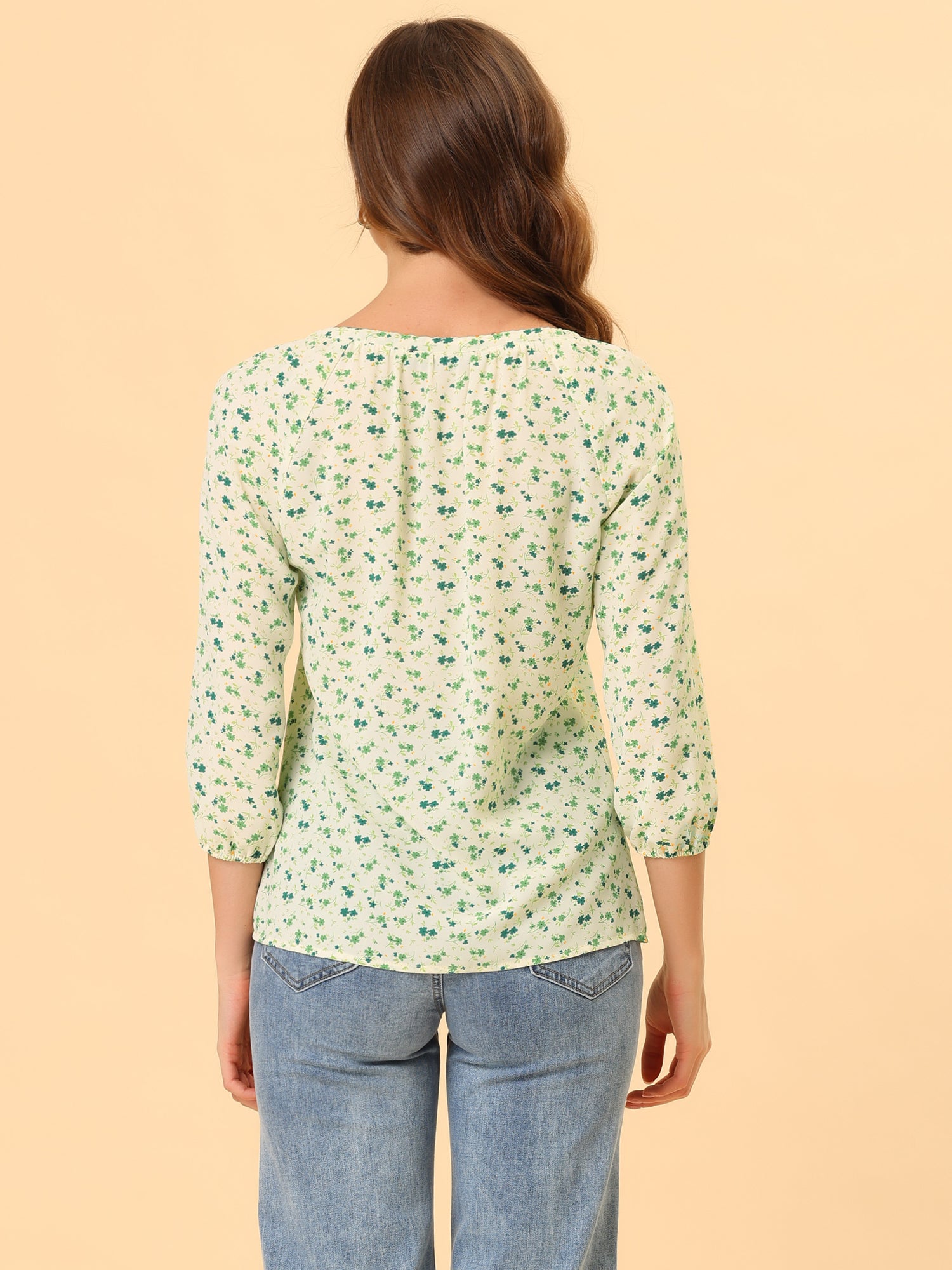 Blusa de mujer con cuello redondo, cordón y mangas raglán 3/4 con estampado floral