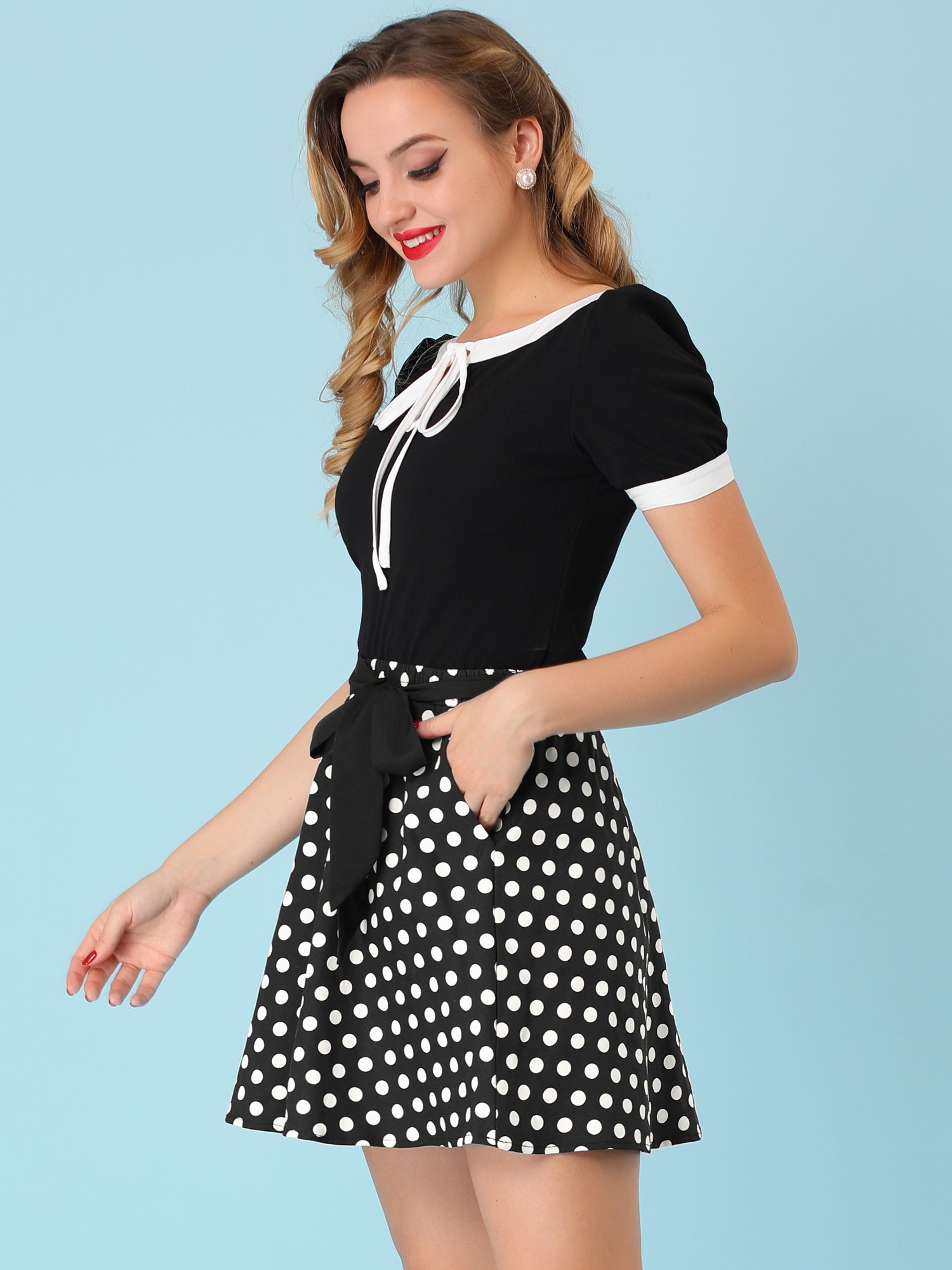 Minifalda retro de lunares con cintura alta, cinturón y bolsillos, estilo años 50 para mujer