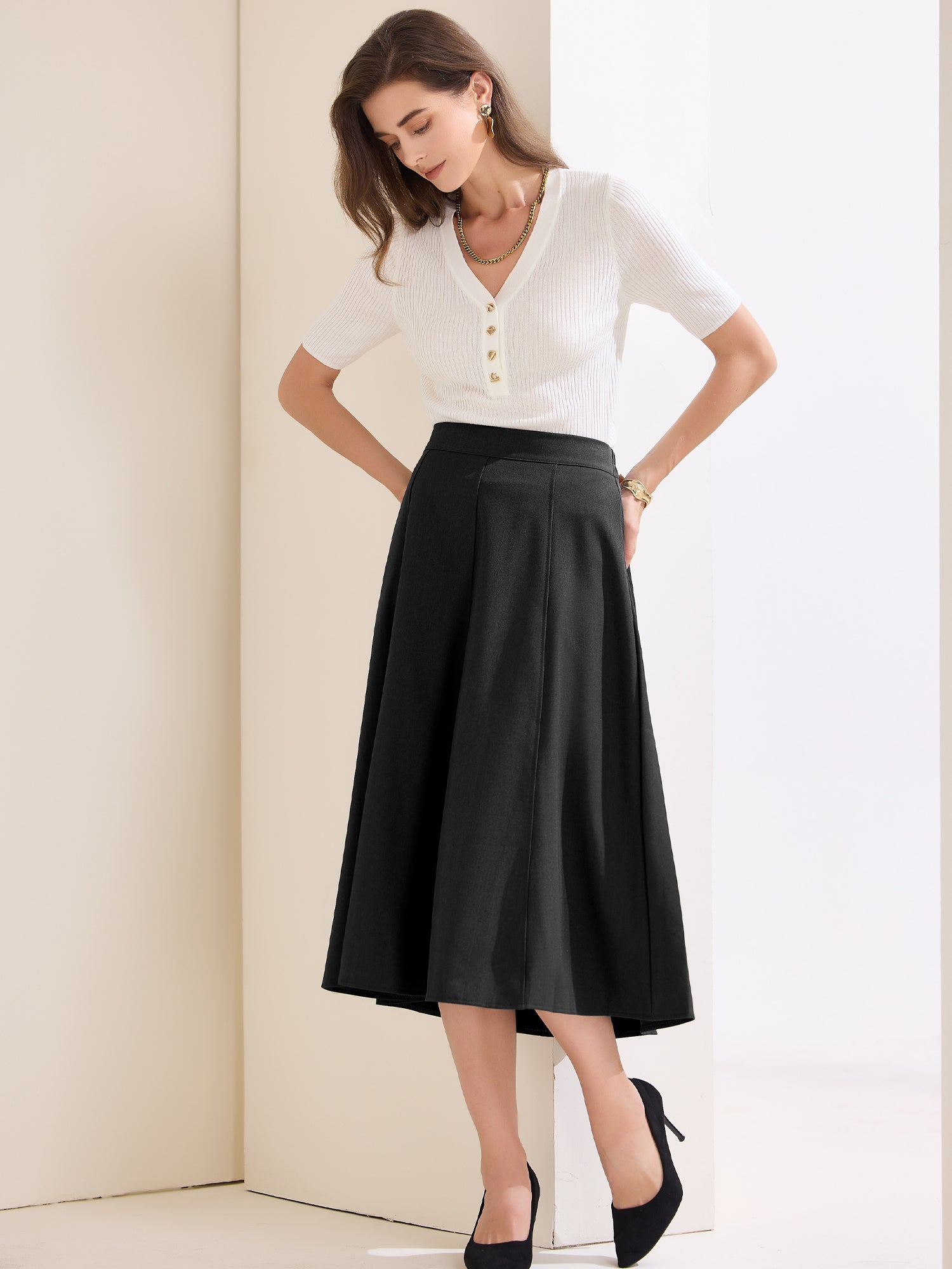 Falda plisada acampanada midi de cintura alta para oficina para mujer
