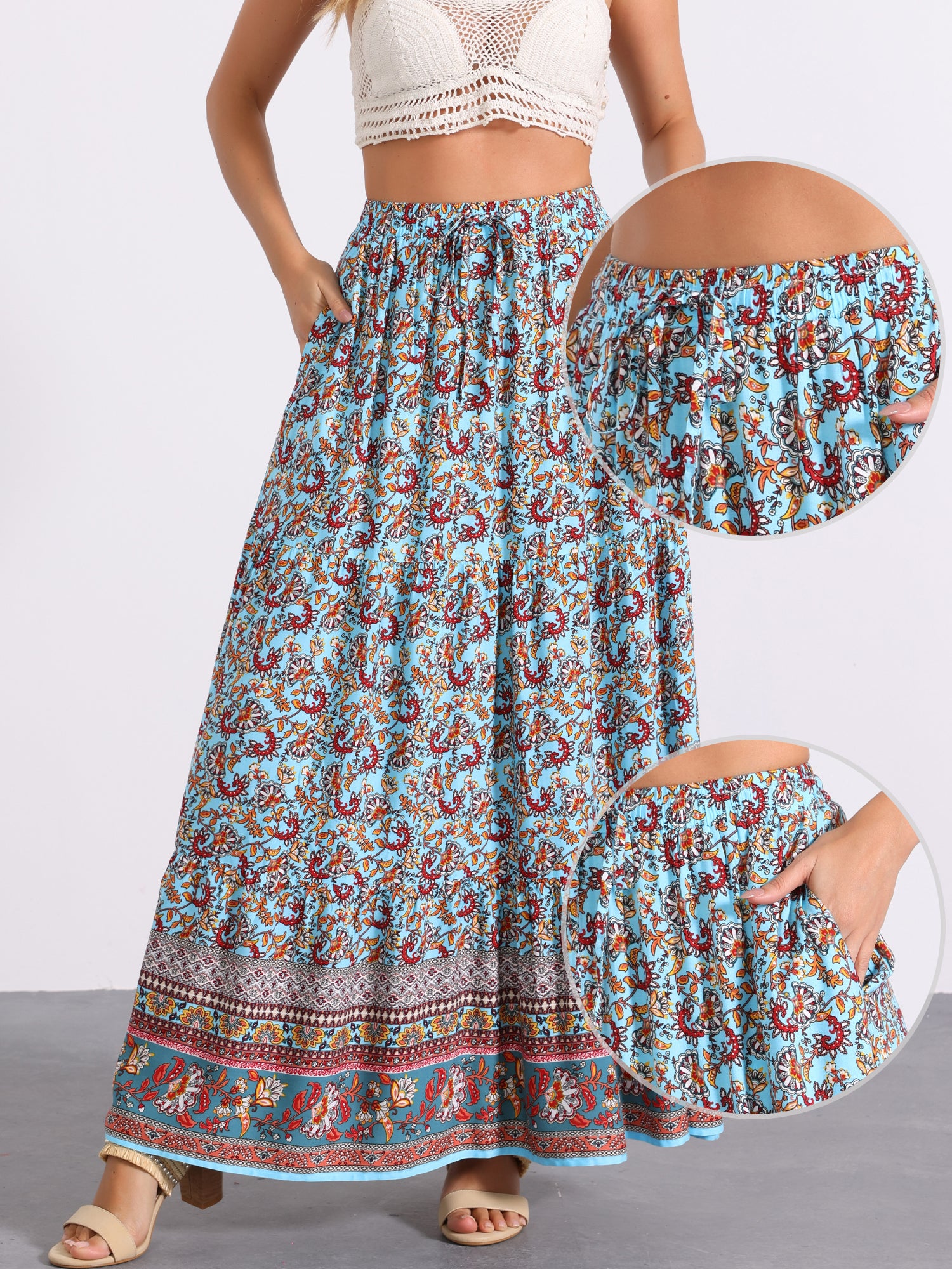 Falda larga estilo bohemio para mujer, de verano, con estampado floral campesino, cintura elástica, corte A