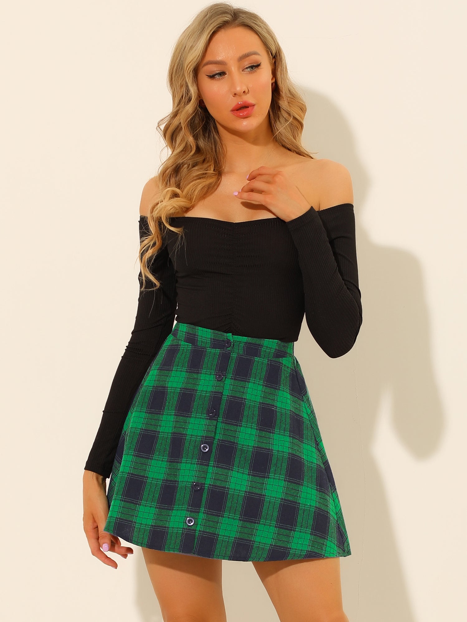Falda patinadora mini de cuadros con botones delanteros en forma de A para mujer