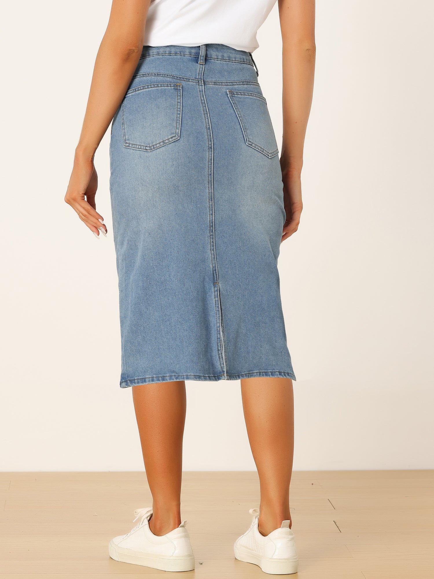 Falda vaquera informal para mujer, cintura alta, bolsillos traseros abiertos, falda vaquera midi