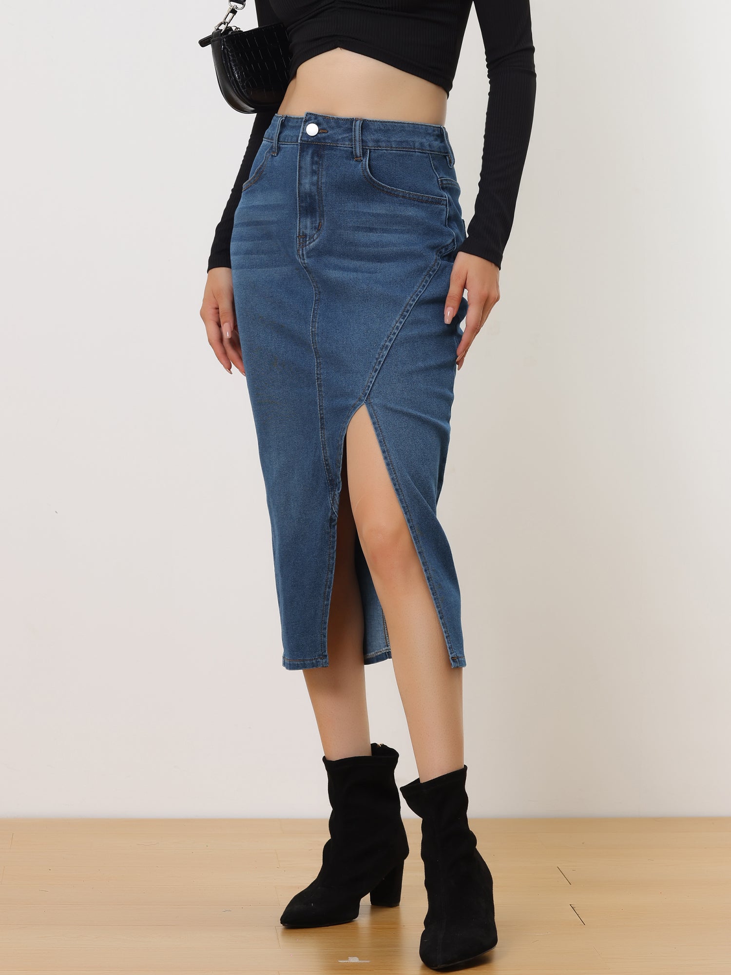 Falda vaquera informal de cintura alta con abertura frontal para mujer