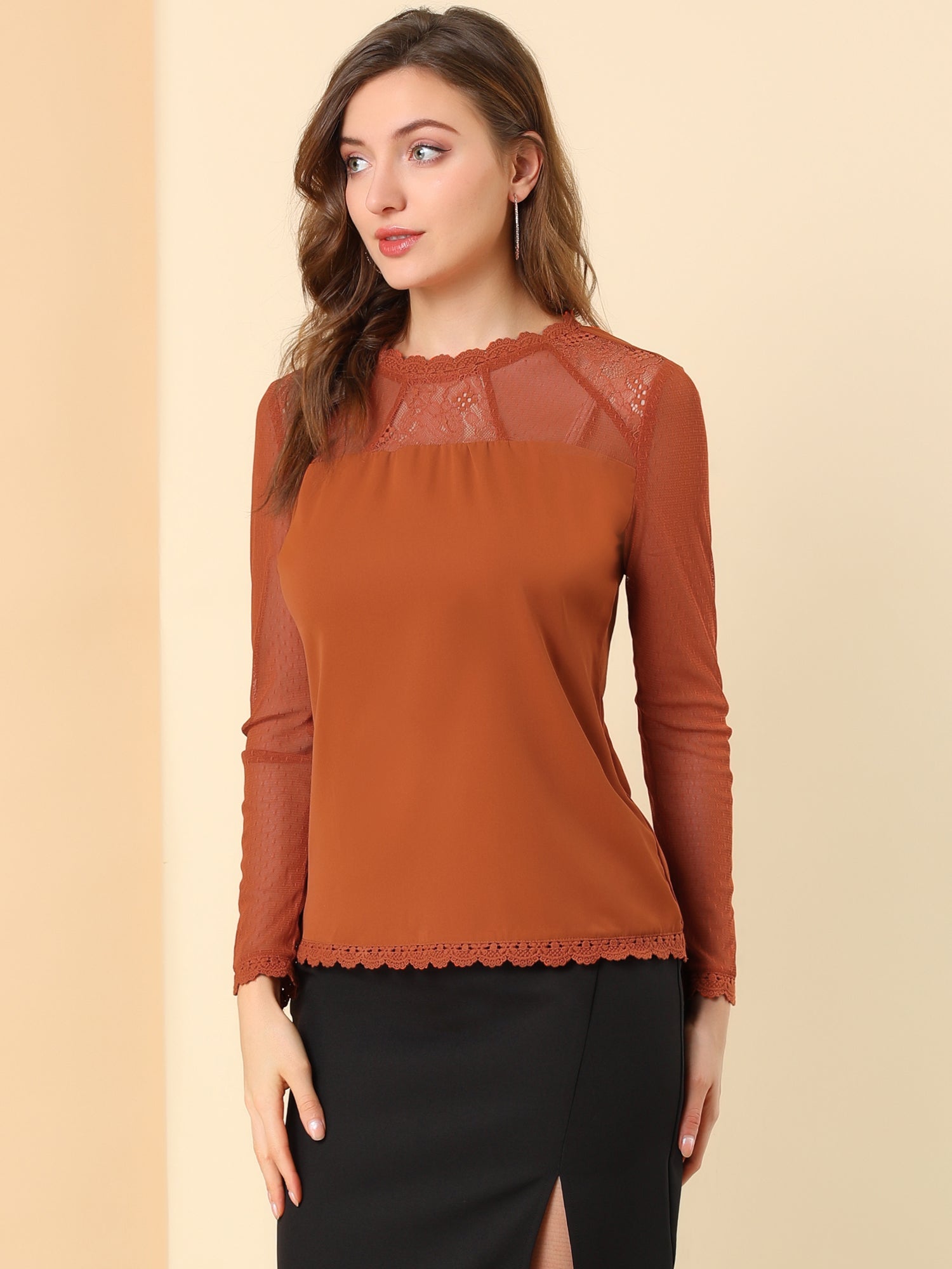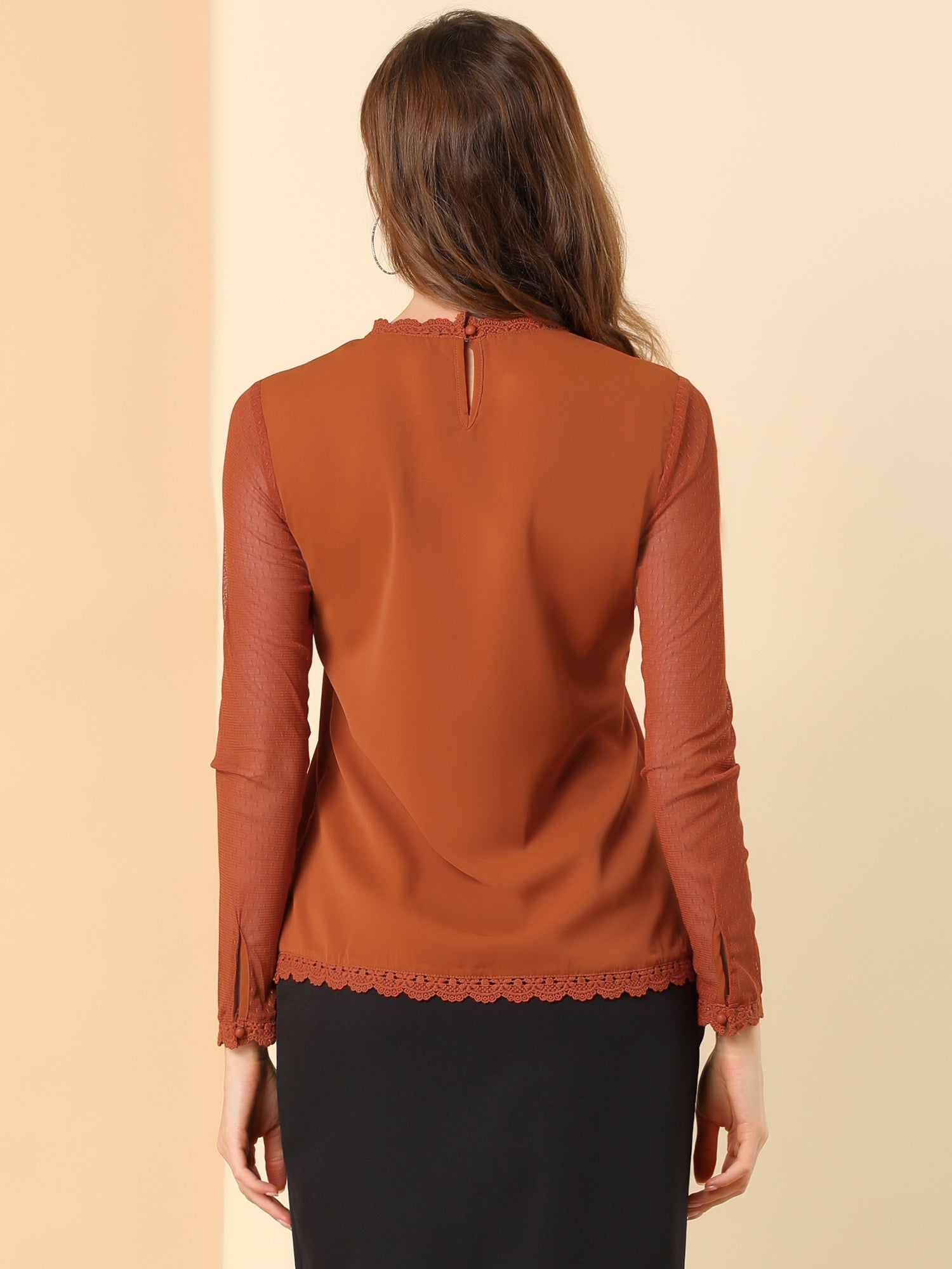 Blusa elegante de gasa con encaje de malla transparente y manga larga para mujer (disponible en tallas grandes)