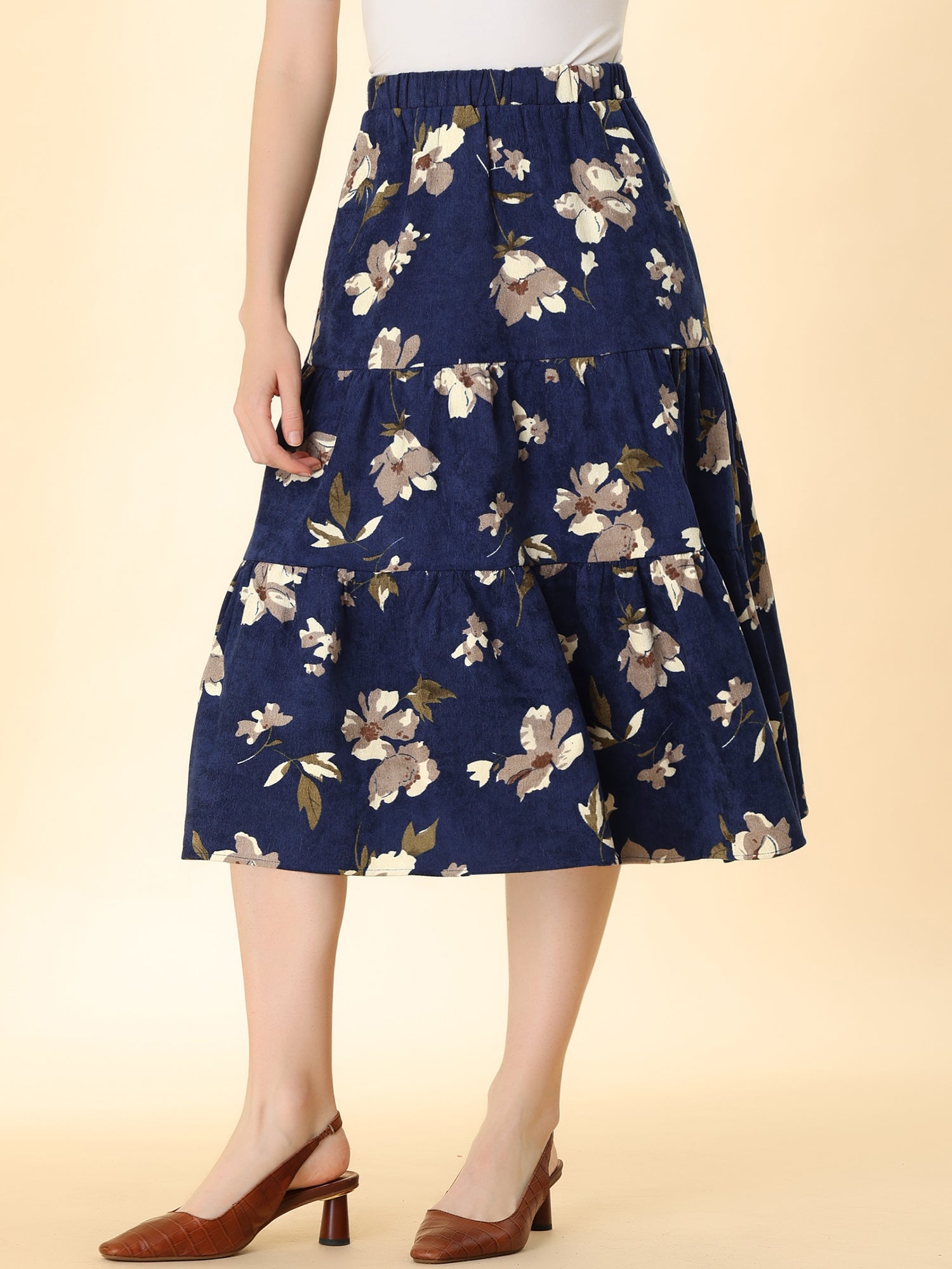 Falda midi de pana con cintura elástica para mujer, corte A, bolsillos, diseño floral escalonado, para otoño e invierno