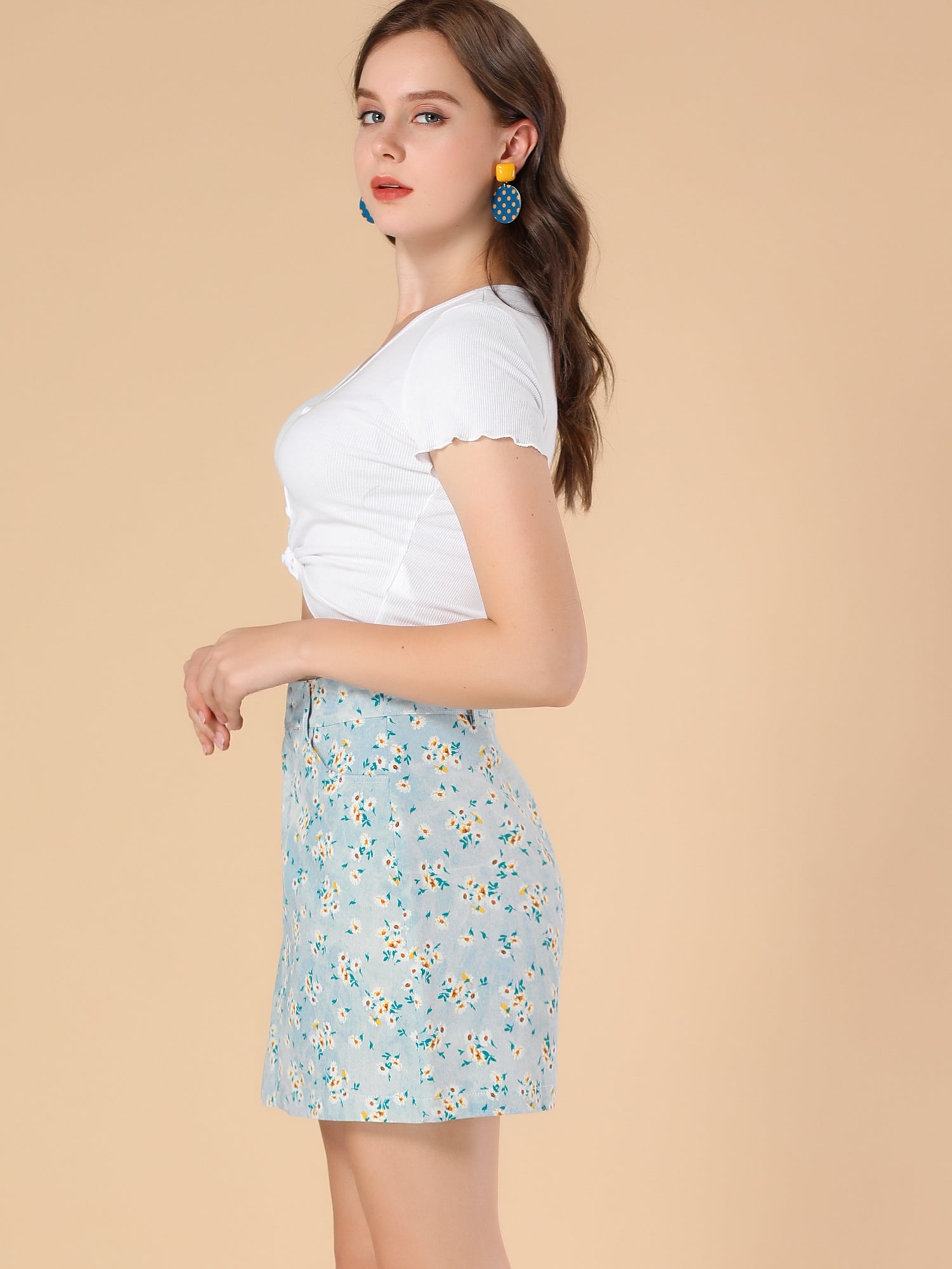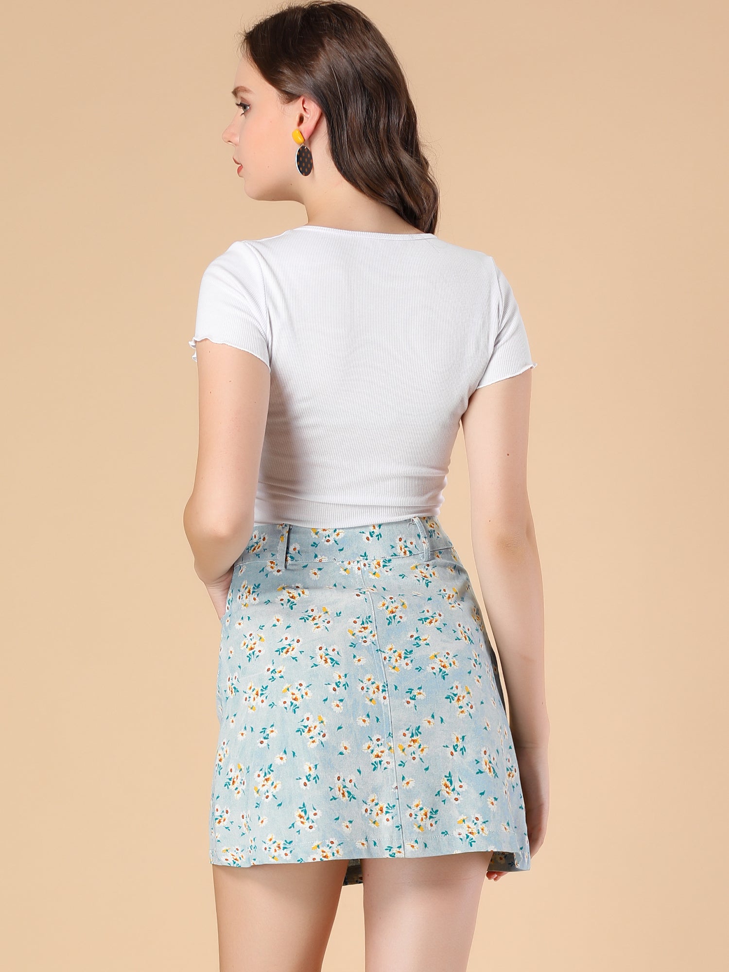 Minifalda de cambray acampanada con bolsillos florales de margaritas para mujer