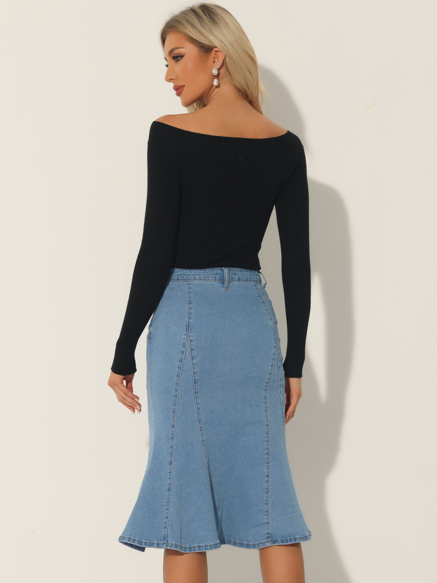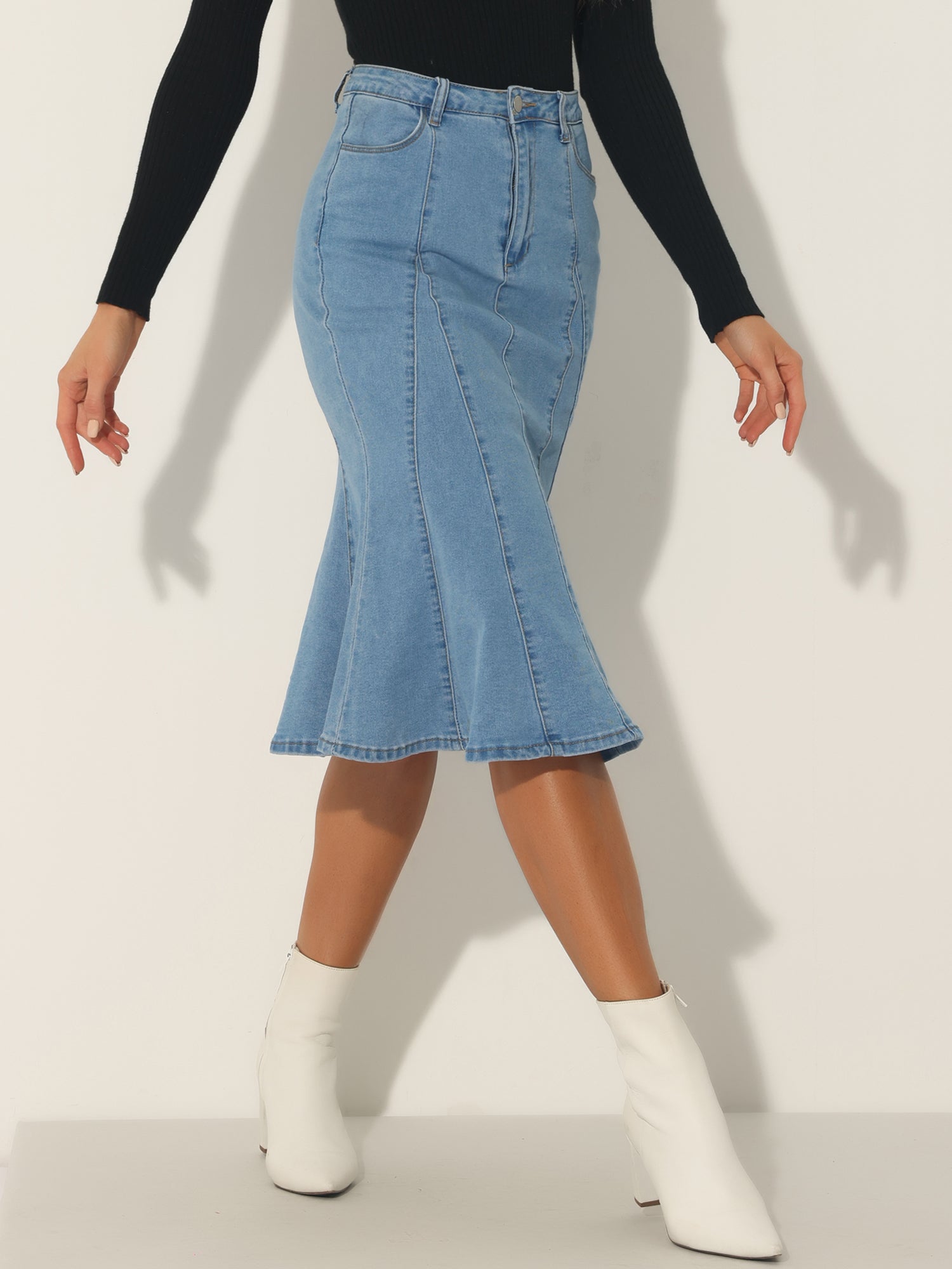 Falda vaquera midi ajustada de cintura alta con volantes y cola de pez para mujer