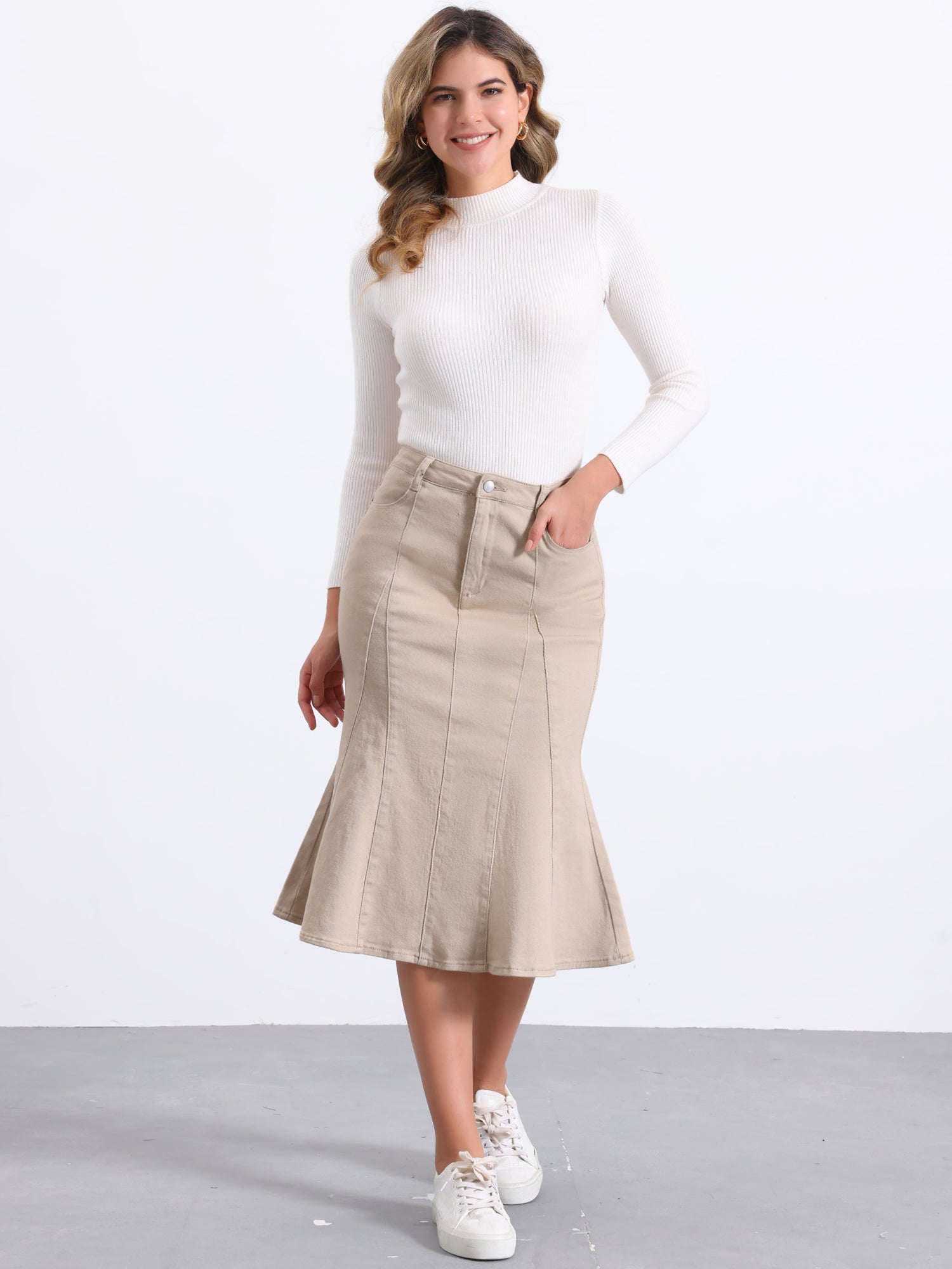 Falda vaquera midi ajustada de cintura alta con volantes y cola de pez para mujer