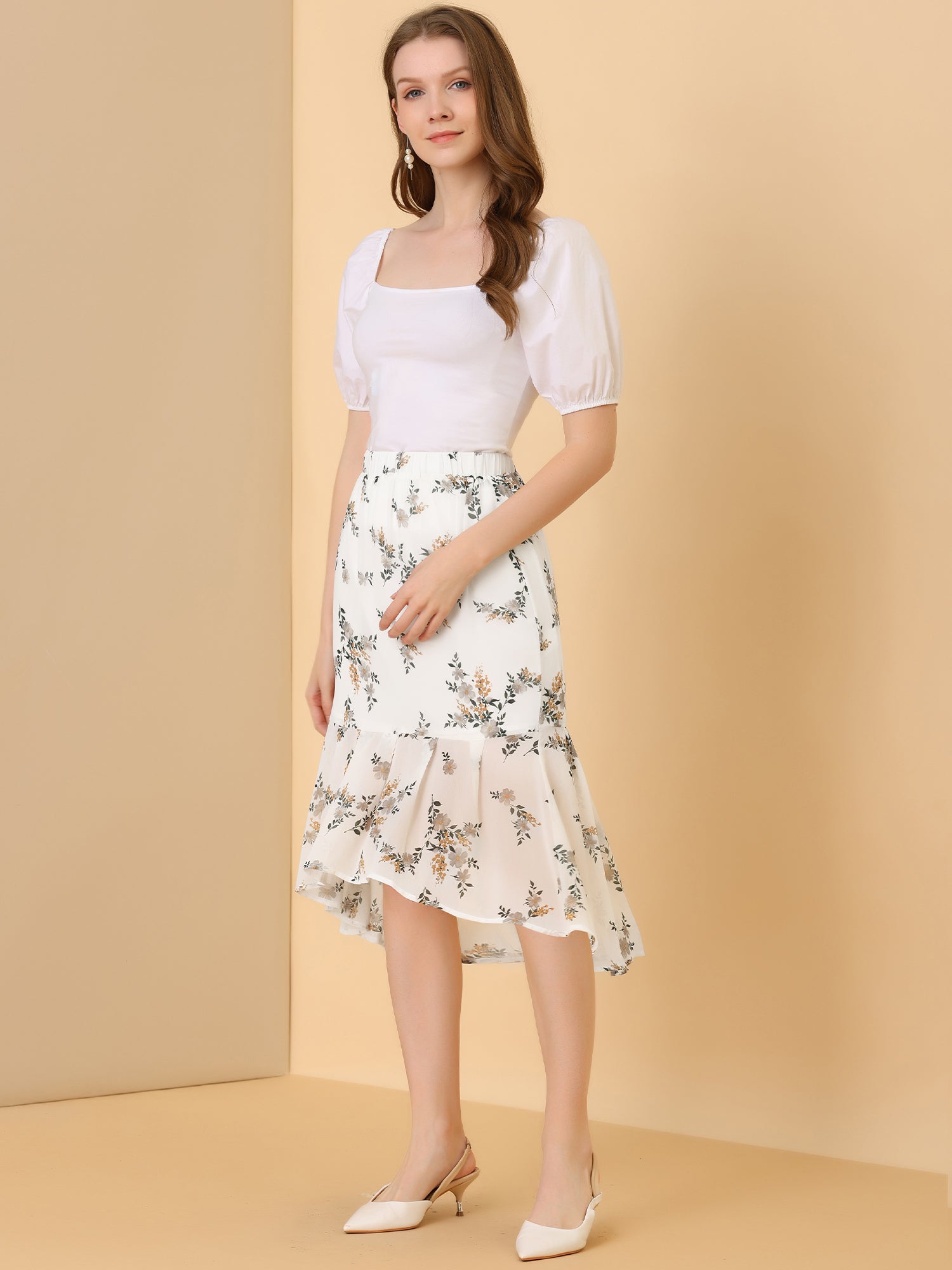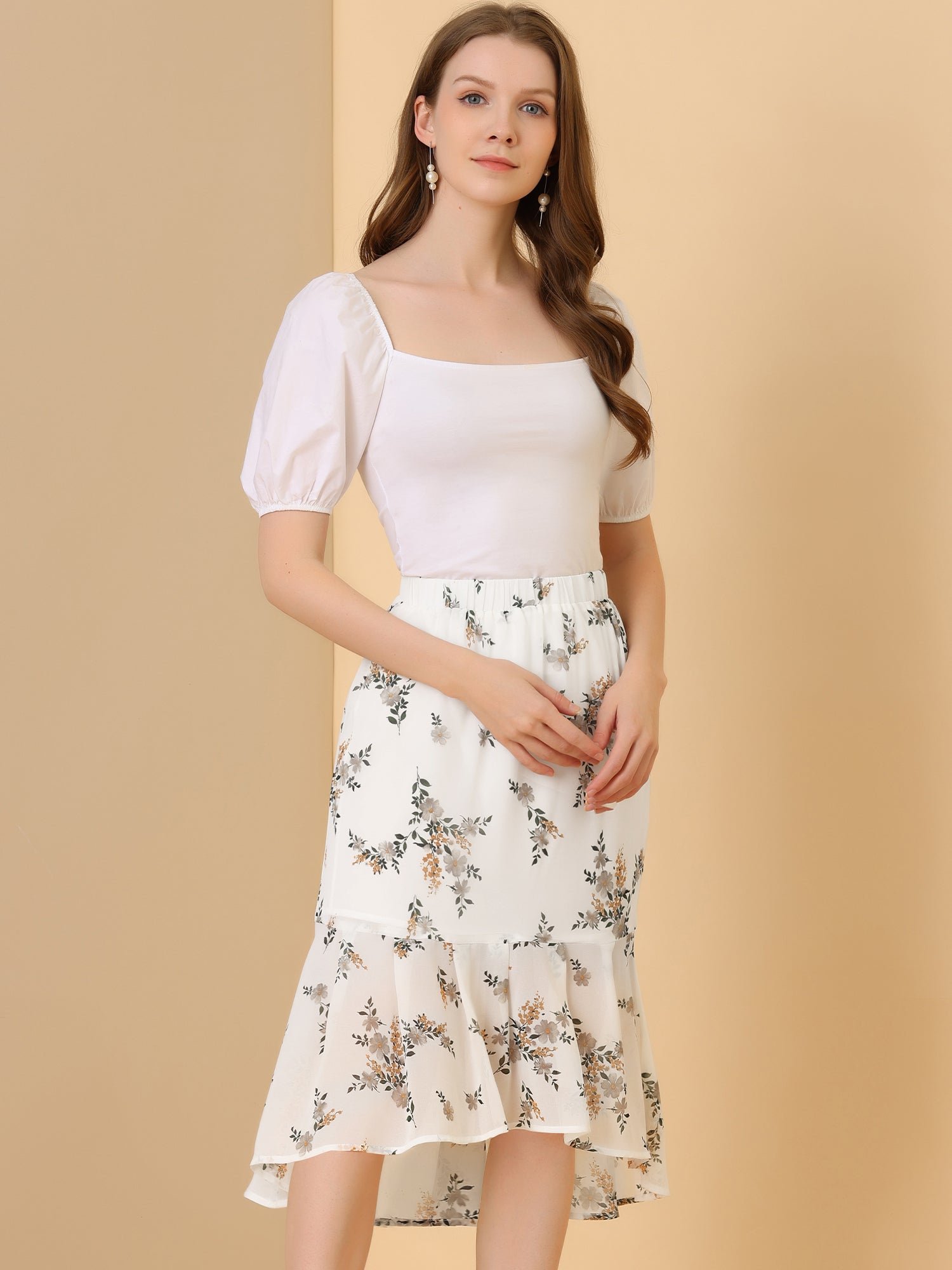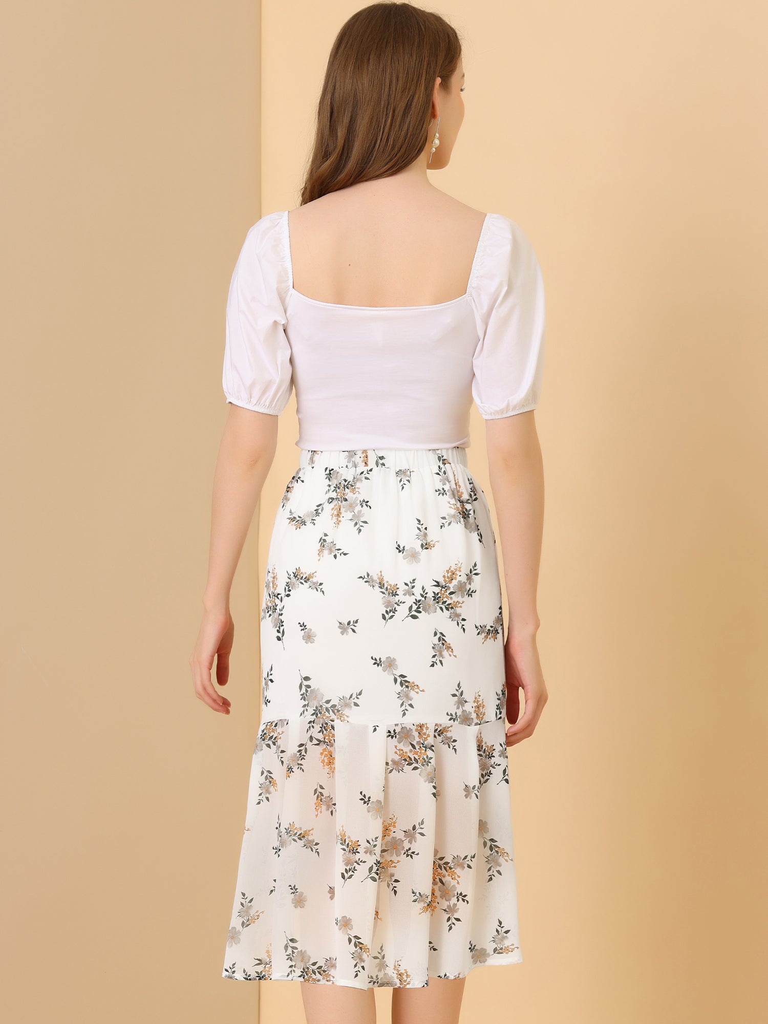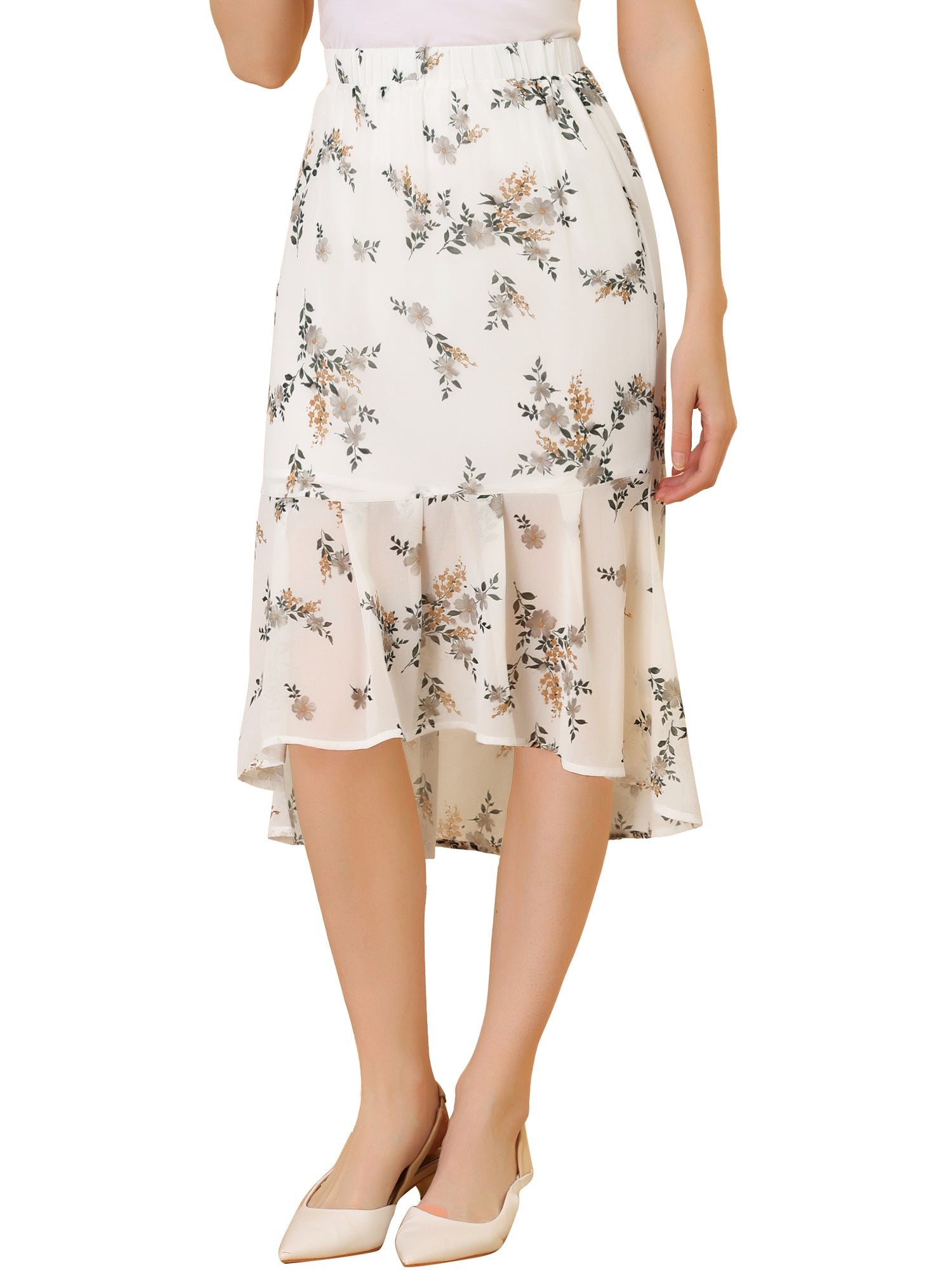 Falda de cola de pez de gasa con cintura elástica y dobladillo con volantes para mujer