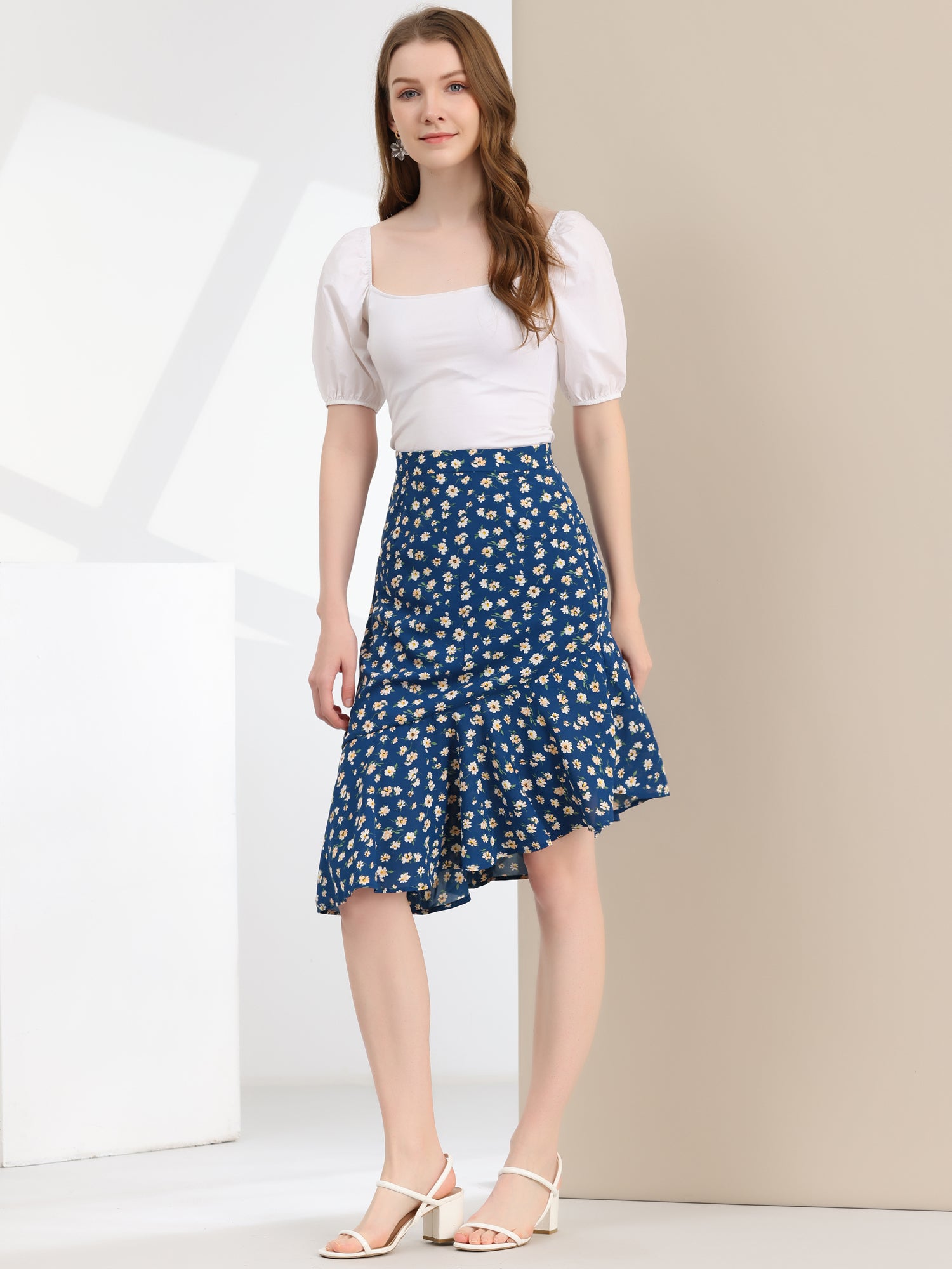 Falda de verano con volantes asimétricos, estilo sirena, cintura alta y elegante diseño floral para mujer