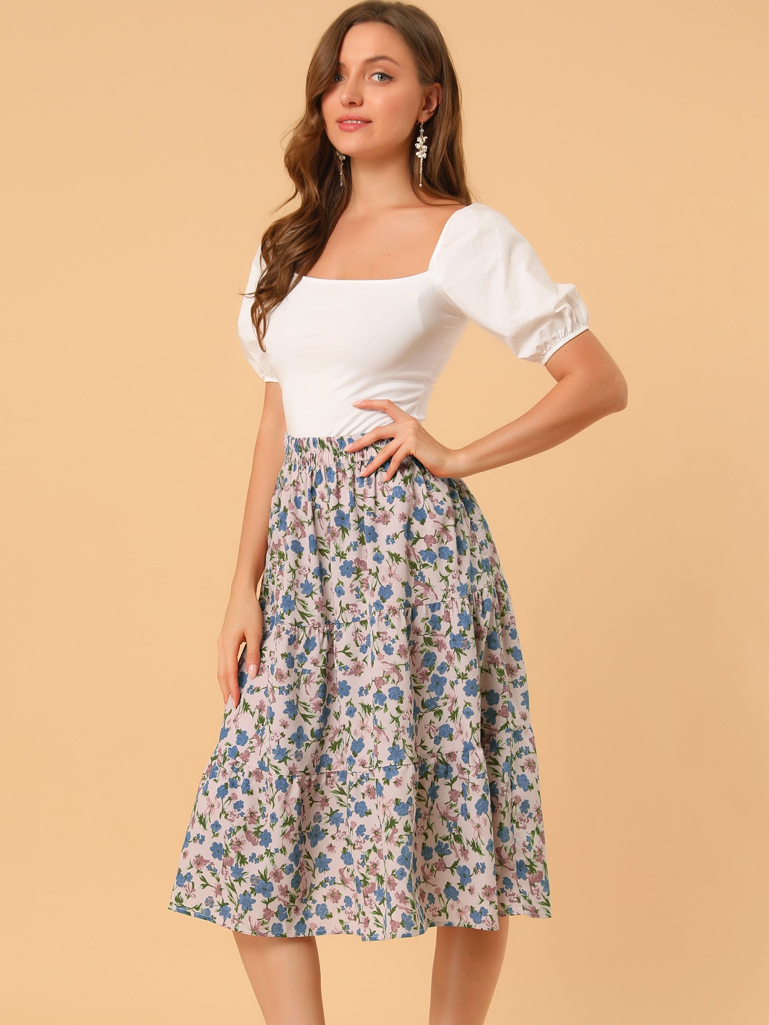 Falda escalonada con dobladillo con volantes, cintura elástica y estampado floral para mujer